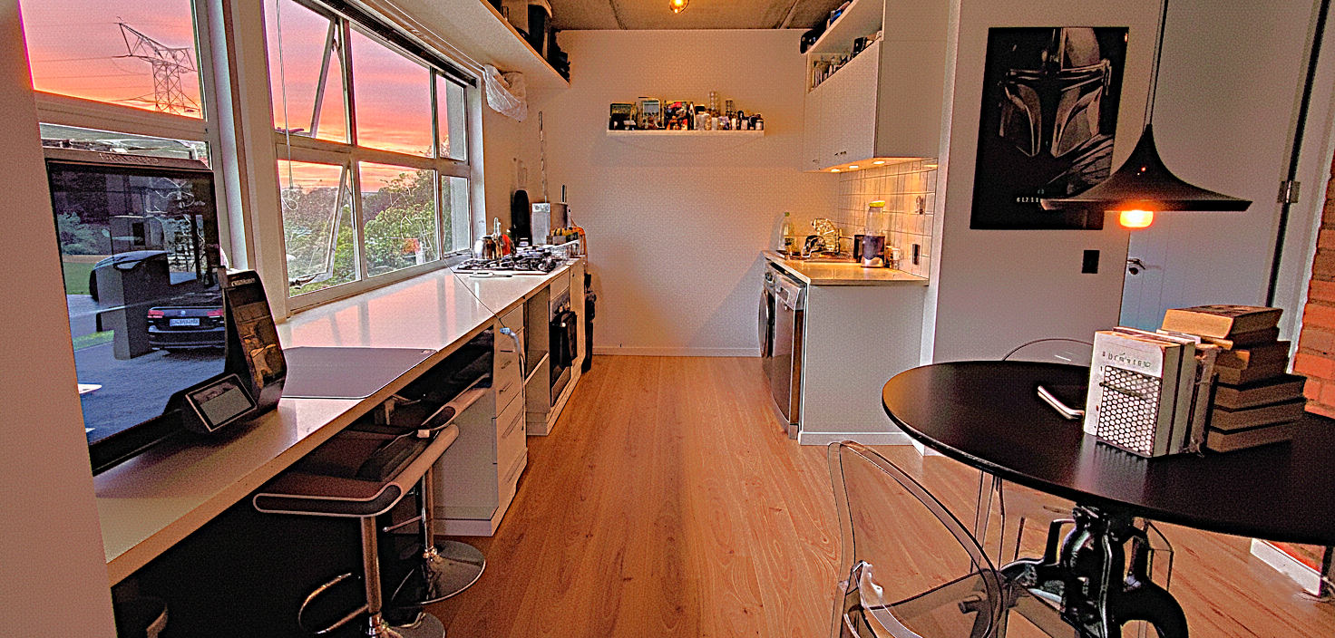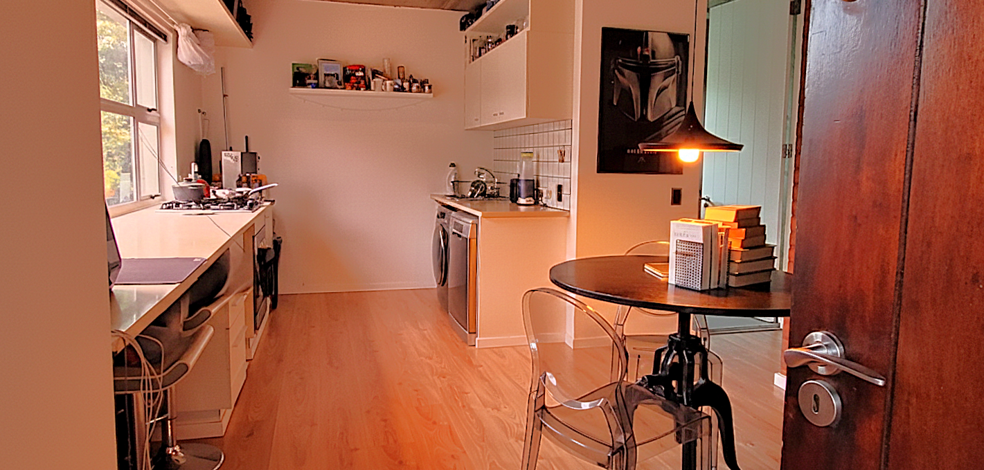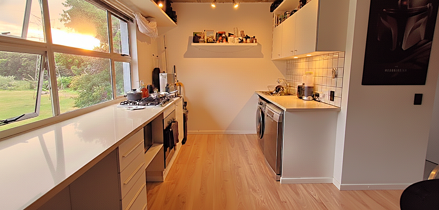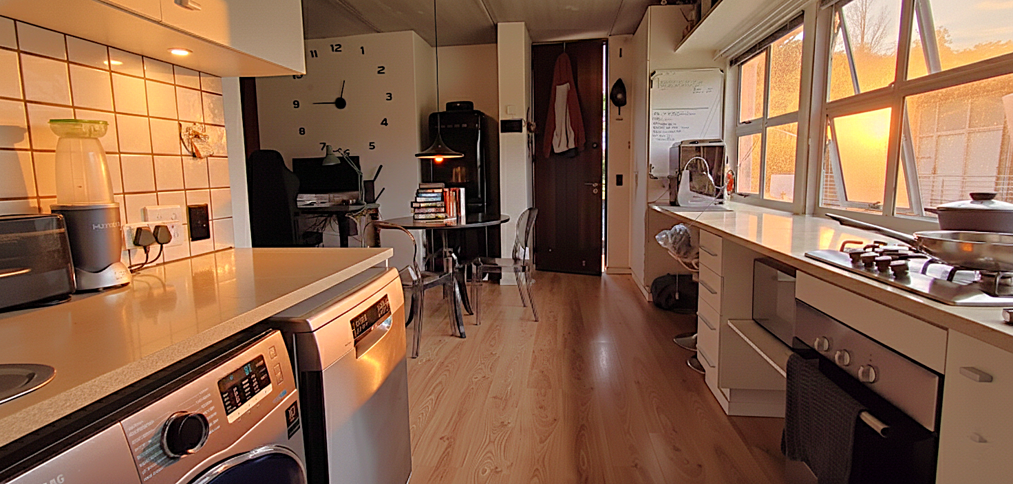 Kitchen: Laminated wooden flooring. Caesar Stone countertops. Under-counter gas oven and hob. Space for appliances.
