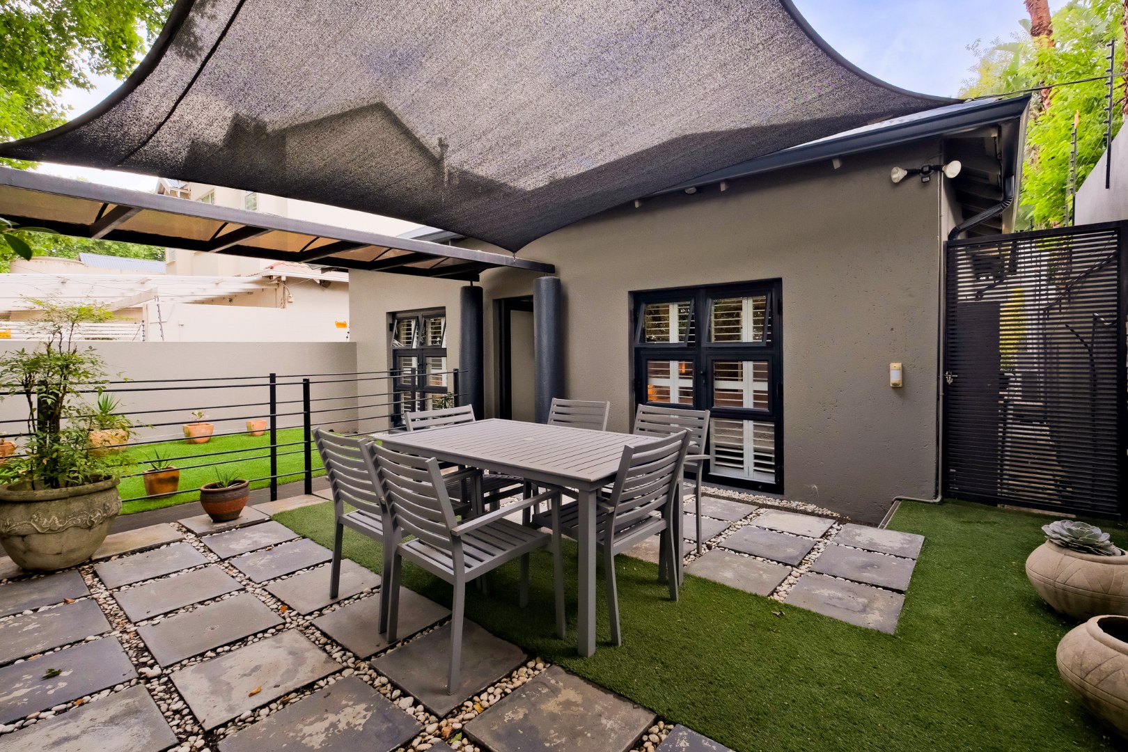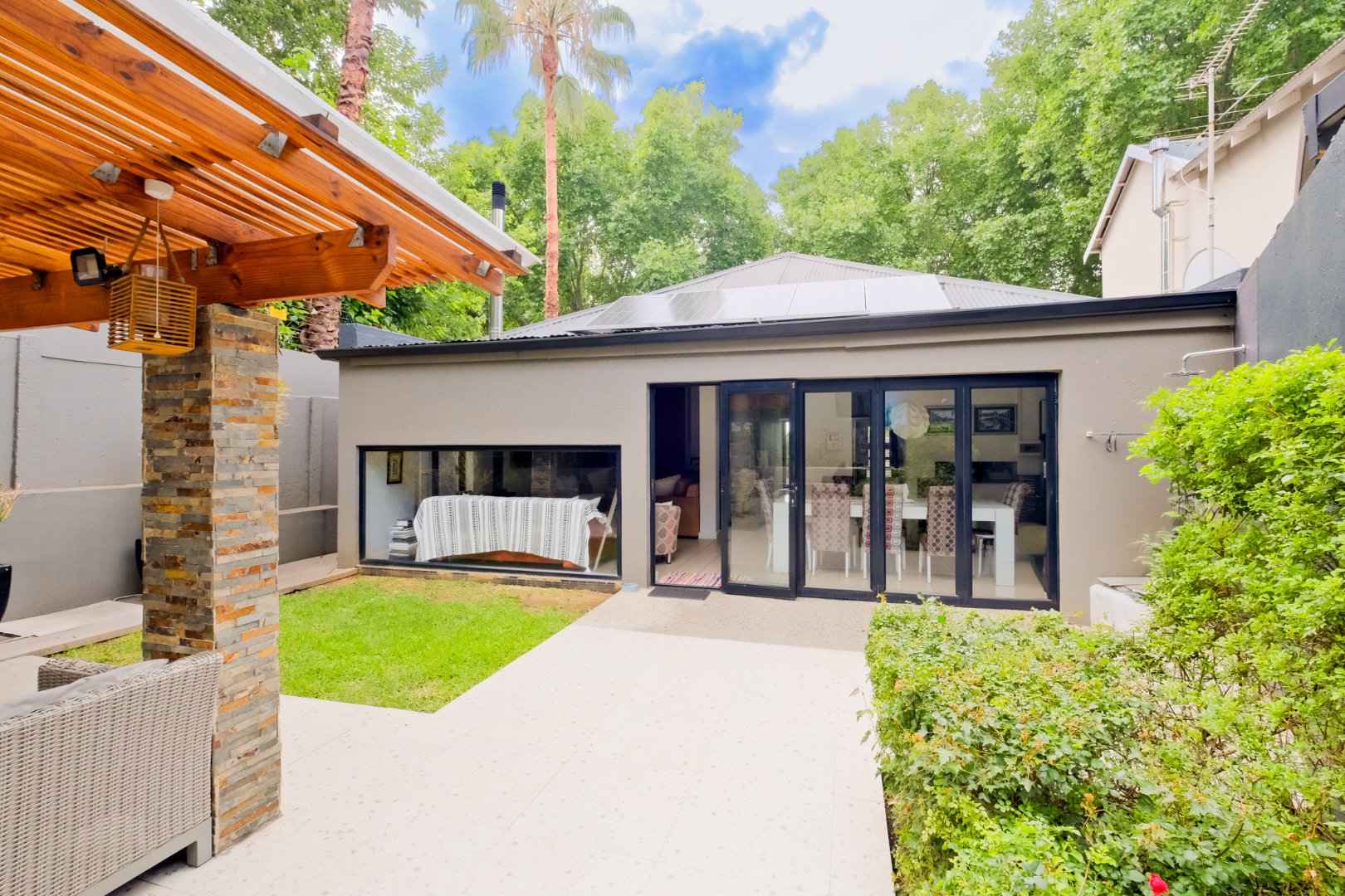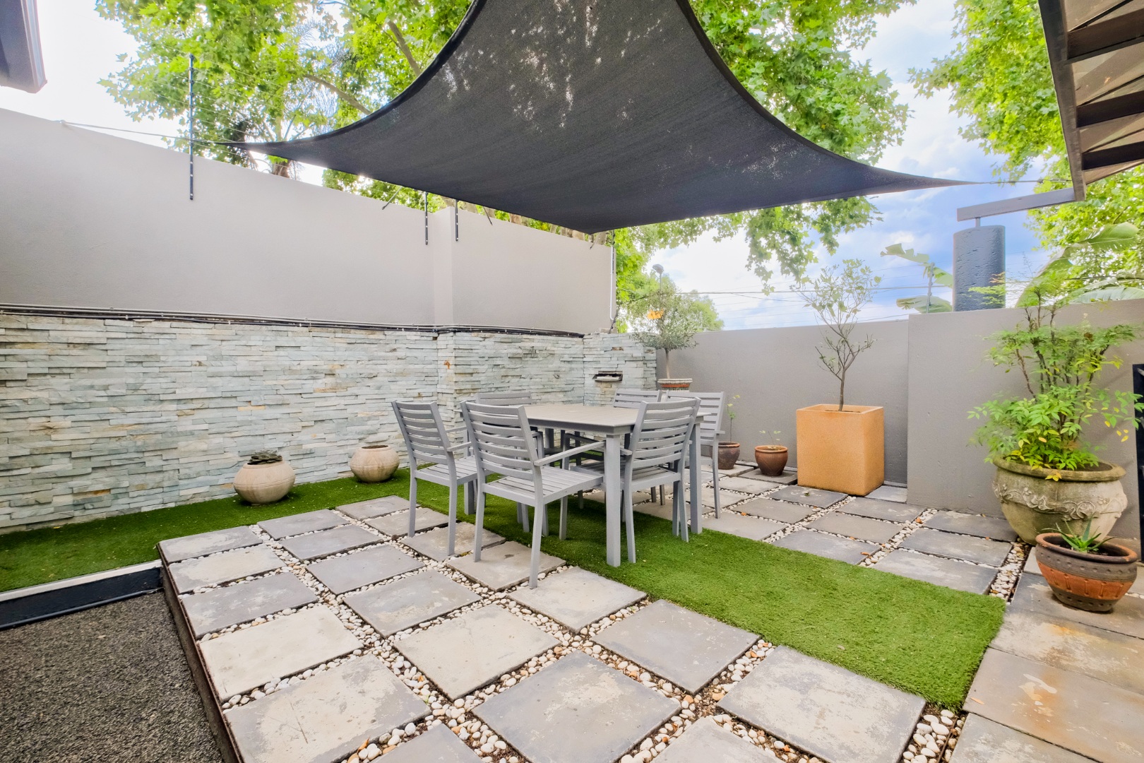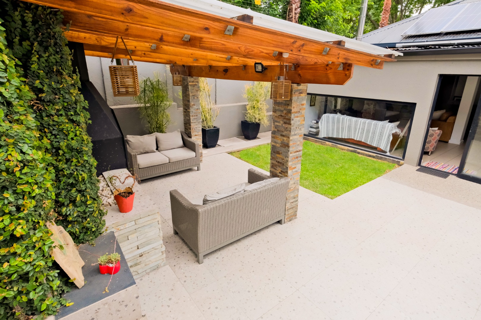 Outside, a small but impeccably maintained garden provides a low-maintenance green space perfect for the busy individual, while lush trees envelope the property, offering privacy and natural beauty. The outdoor entertainment area includes a built-in braai and a covered patio — a superb setting for gatherings or quiet evenings.