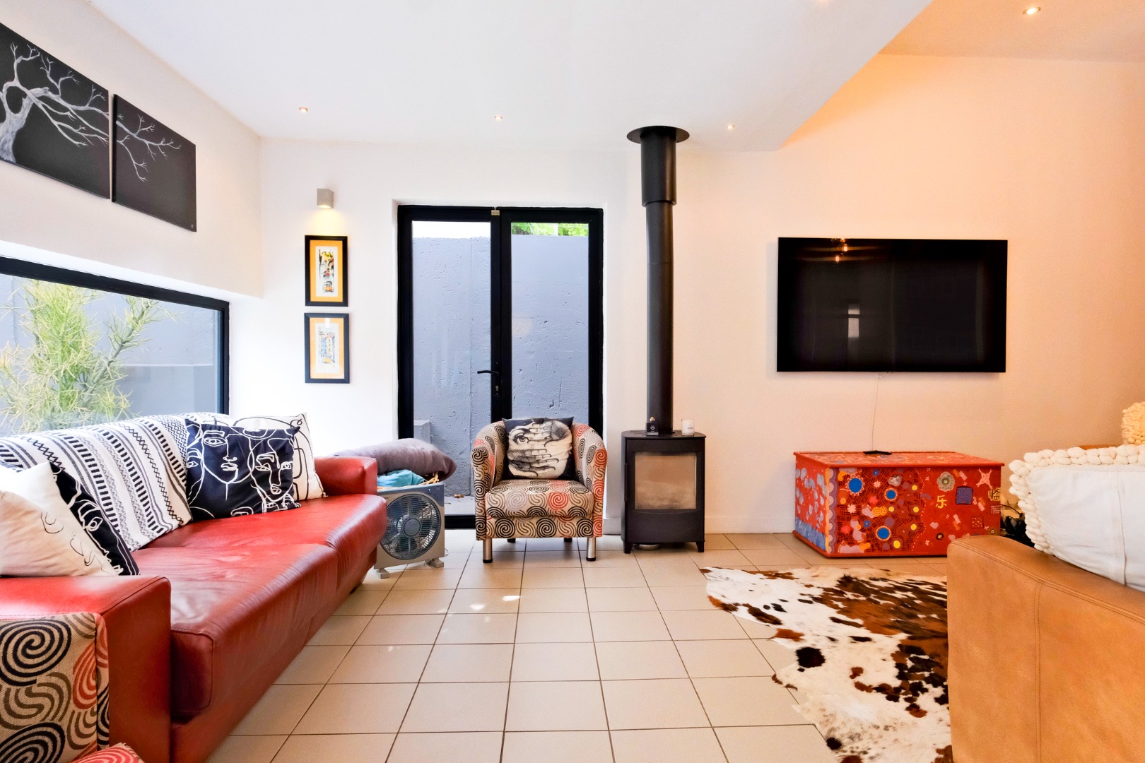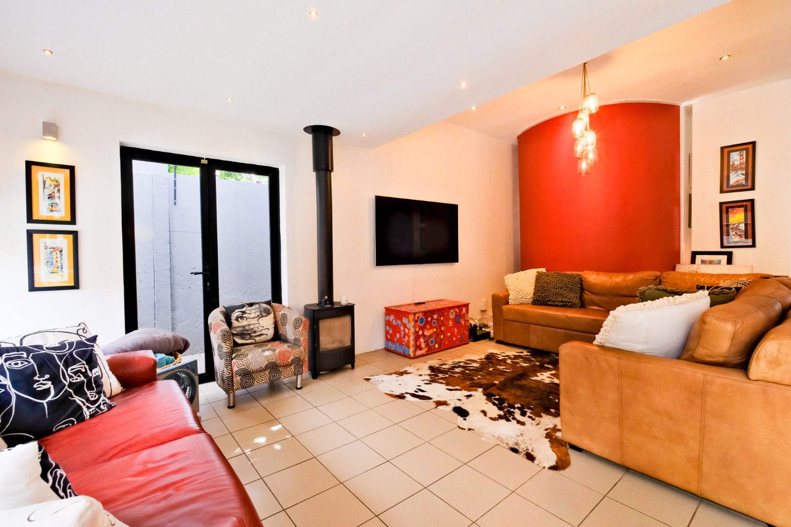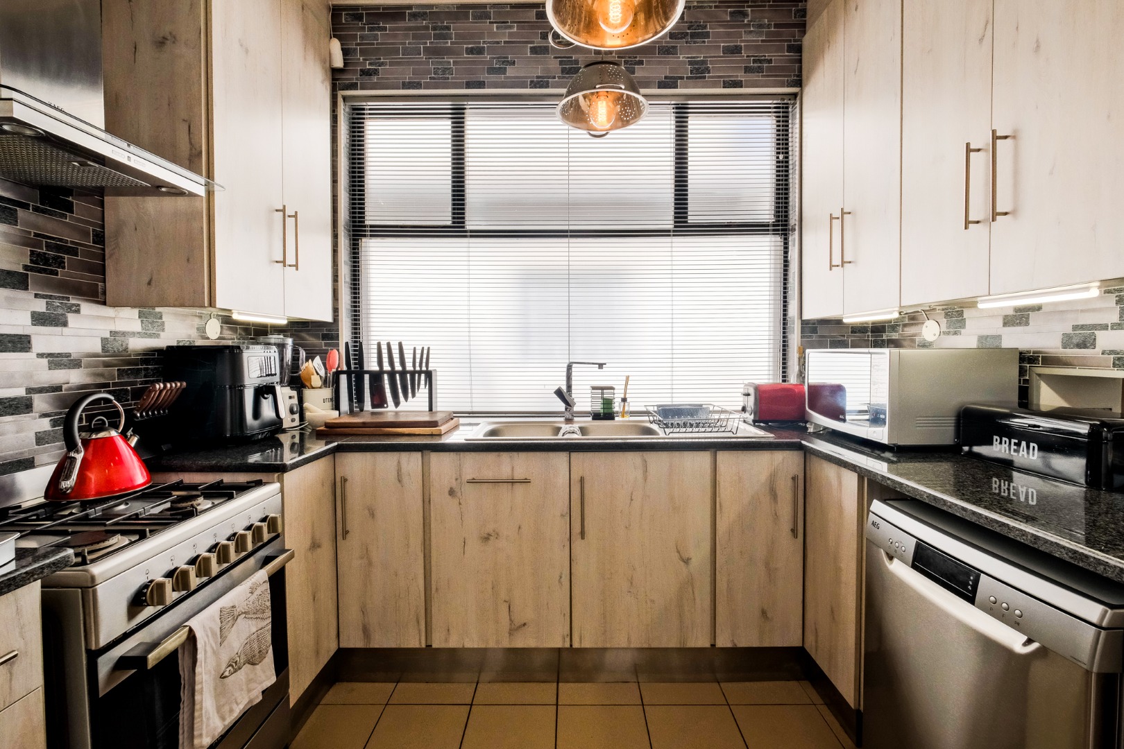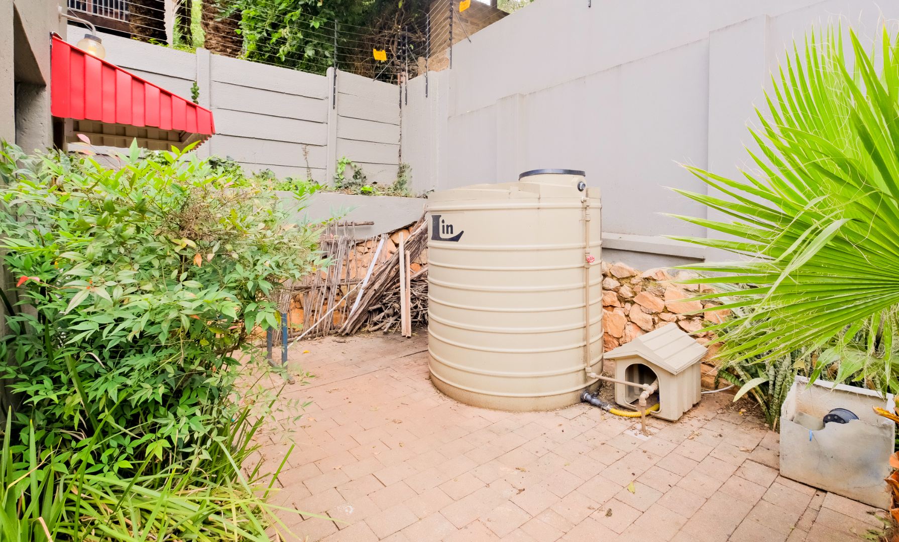 Outside, a small but impeccably maintained garden provides a low-maintenance green space perfect for the busy individual, while lush trees envelope the property, offering privacy and natural beauty. The outdoor entertainment area includes a built-in braai and a covered patio — a superb setting for gatherings or quiet evenings.