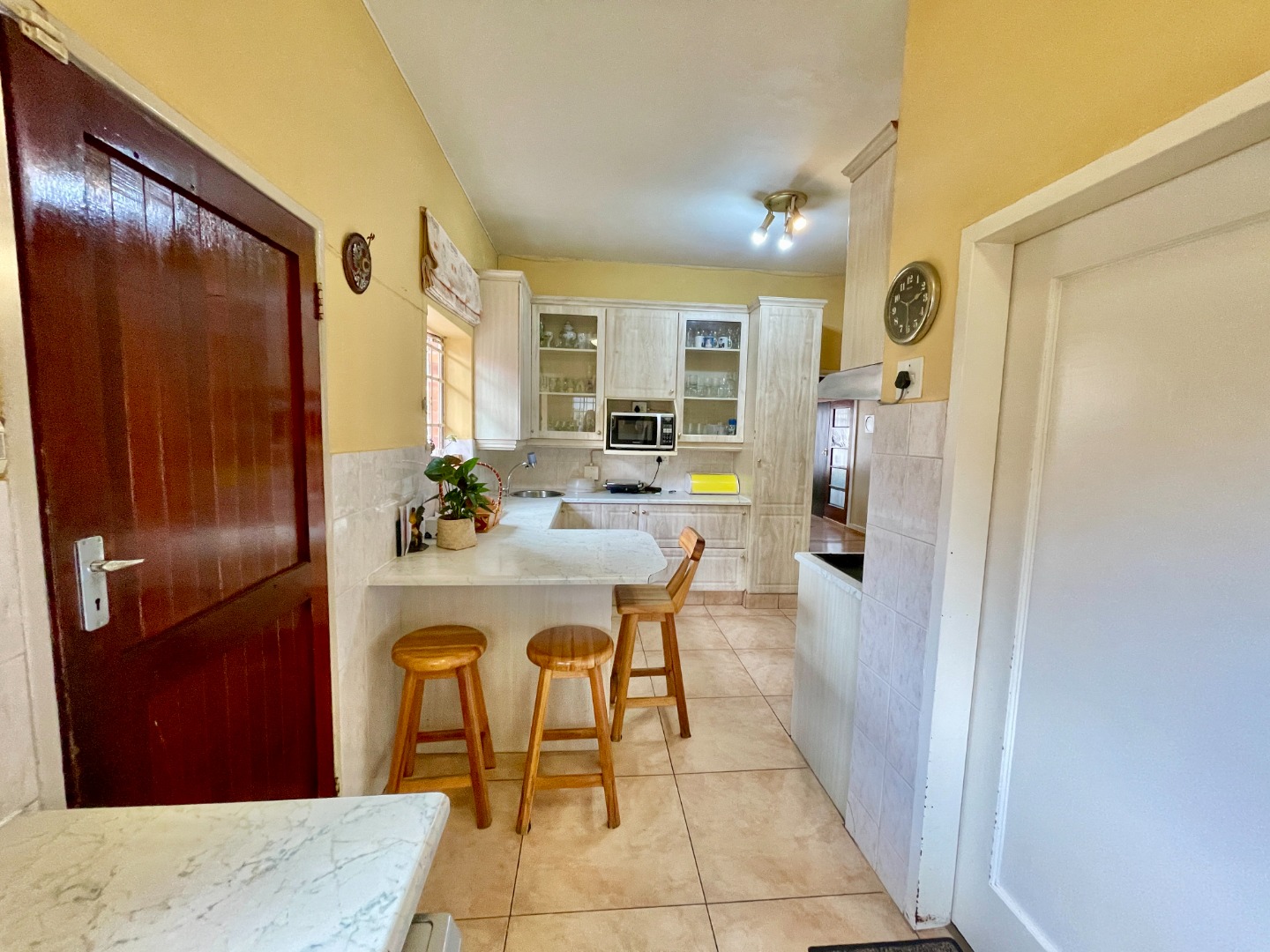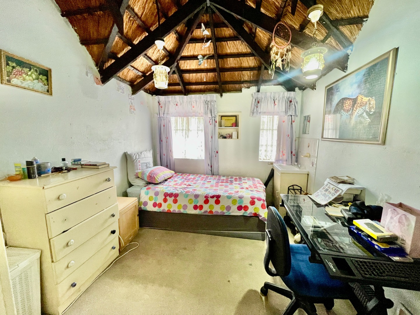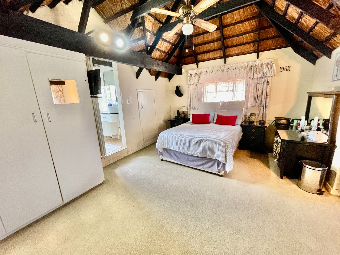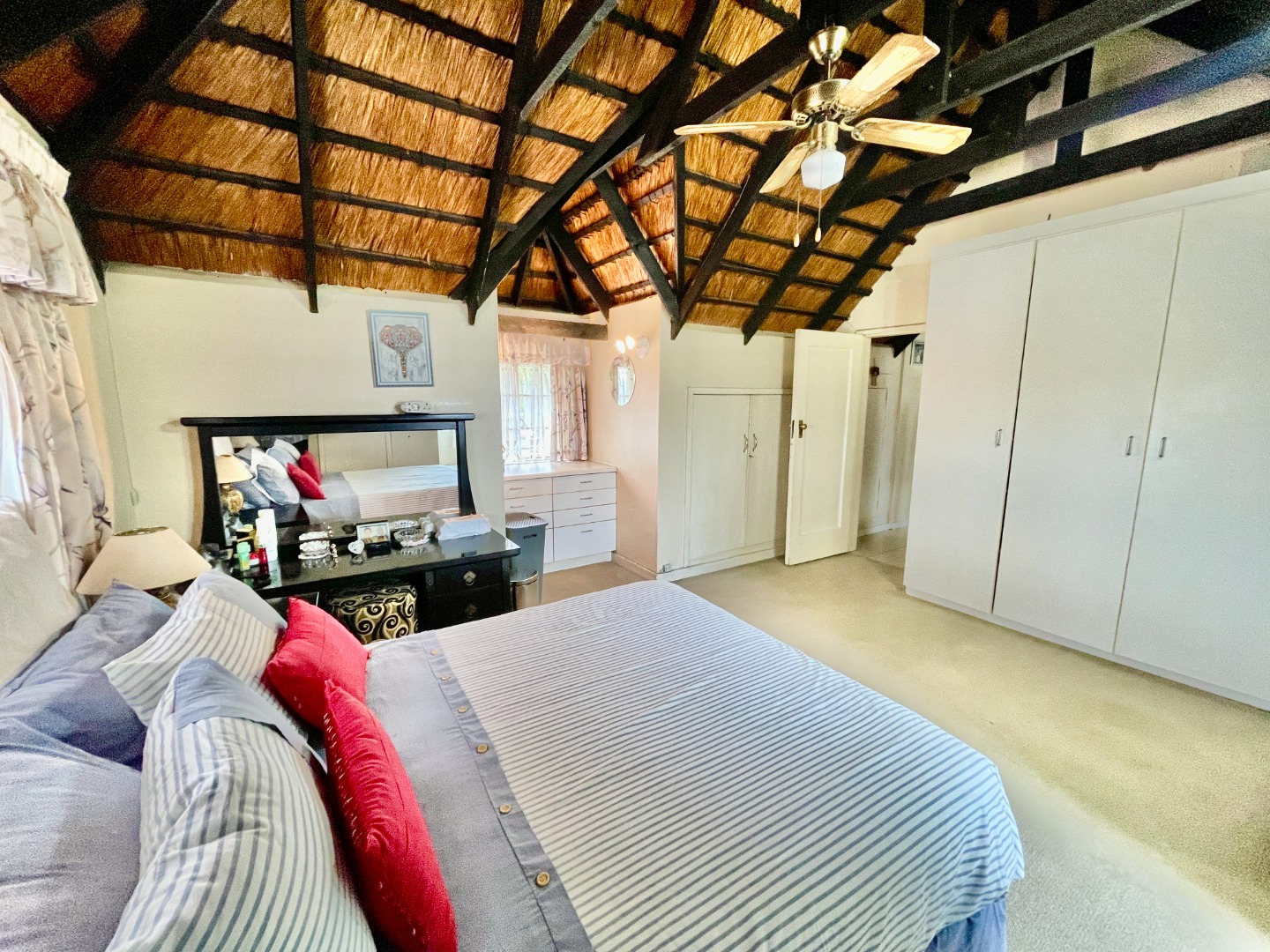 This face-brick house immediately captivates with its unique thatched roof, offering exceptional kerb appeal and a rustic yet elegant aesthetic. Set on a generous 1004 sqm erf, the property boasts a well-maintained garden.