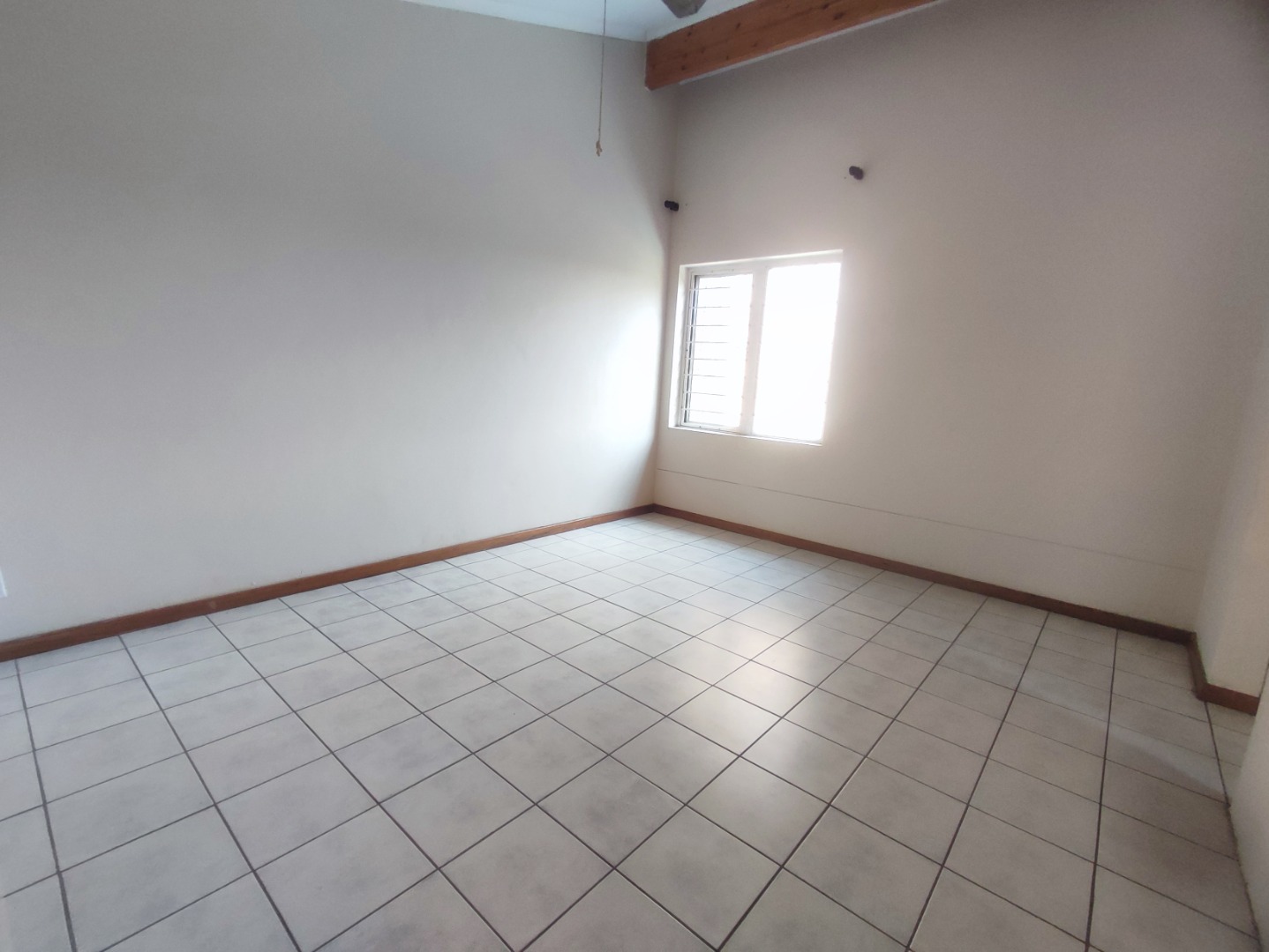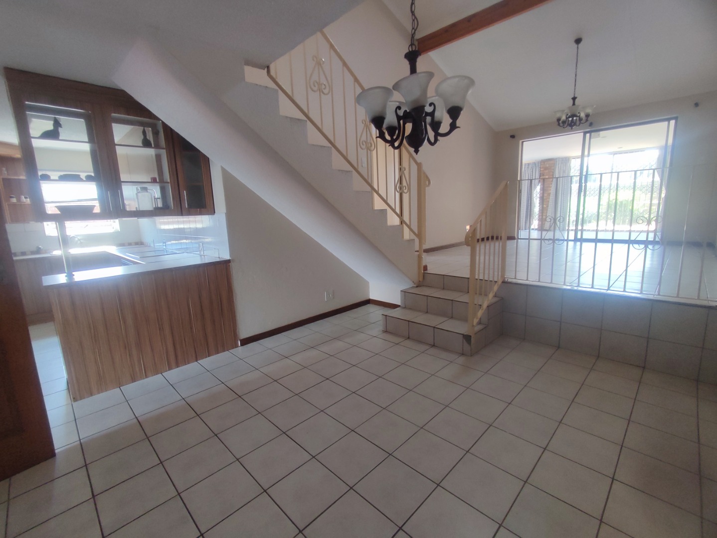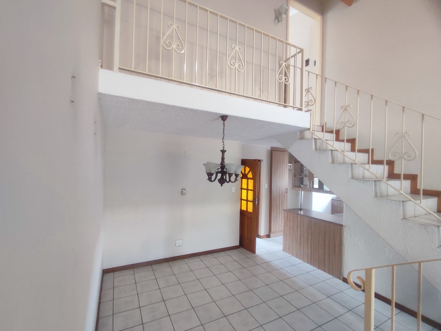 The interior boasts an inviting open-plan living and dining area, characterized by durable tiled flooring and high ceilings that create a spacious atmosphere. Architectural interest is added by exposed wooden beams and a versatile loft space, perfect for an additional lounge or study. A functional kitchenette/bar is neatly integrated under the staircase, enhancing the home's practical layout. While some areas present an opportunity for modernization, such as the textured ceilings and certain railings, the neutral palette provides a blank canvas for your personal touch.