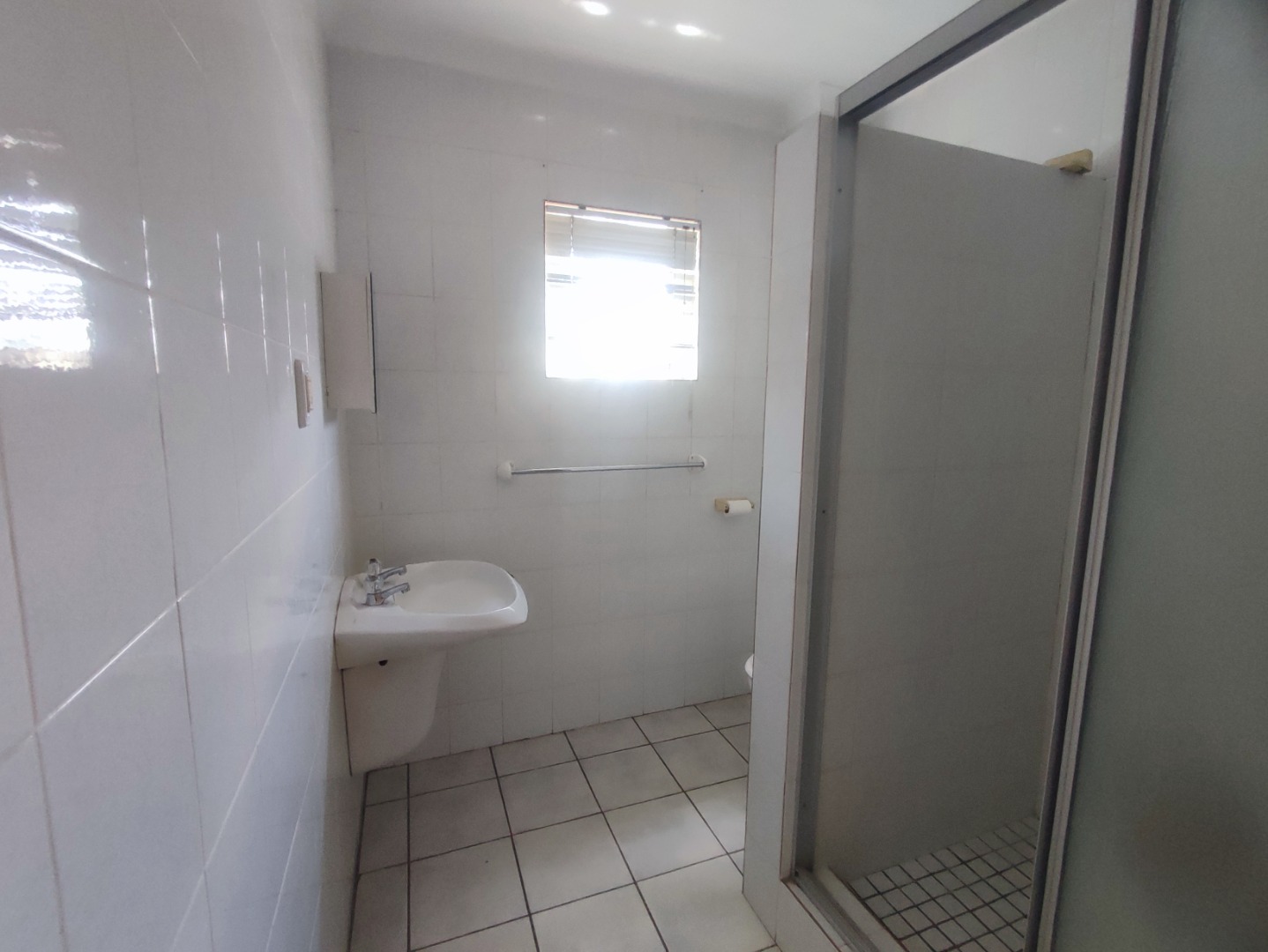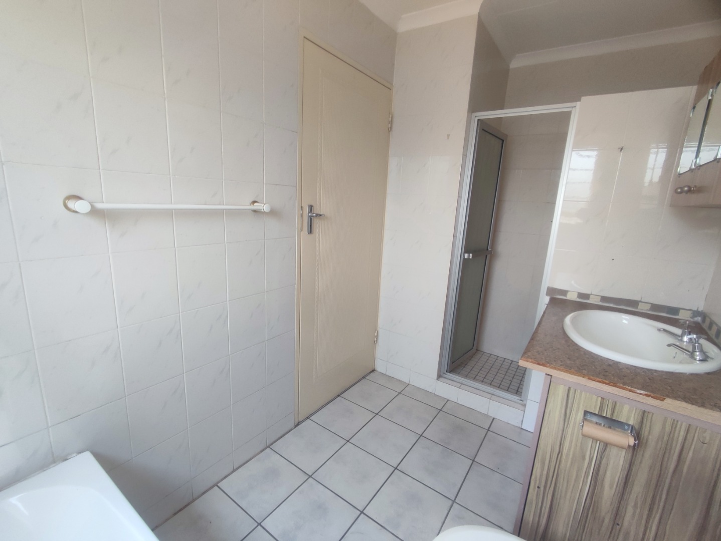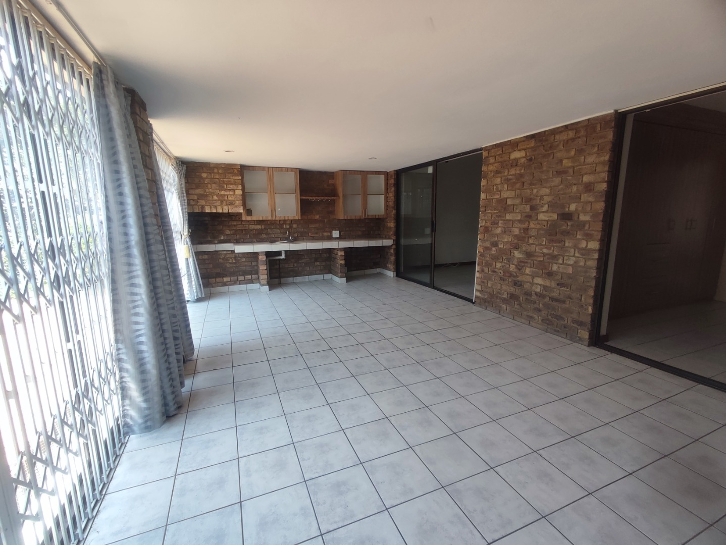 Step outside to a private and well-maintained patio and garden area, featuring light-colored brick paving and lush greenery, enclosed by high brick walls for ultimate privacy and security. The property includes a single garage and an additional parking space. Security is paramount, with features such as electric fencing, an access gate, burglar bars, and a security gate, all within a secure complex environment.
