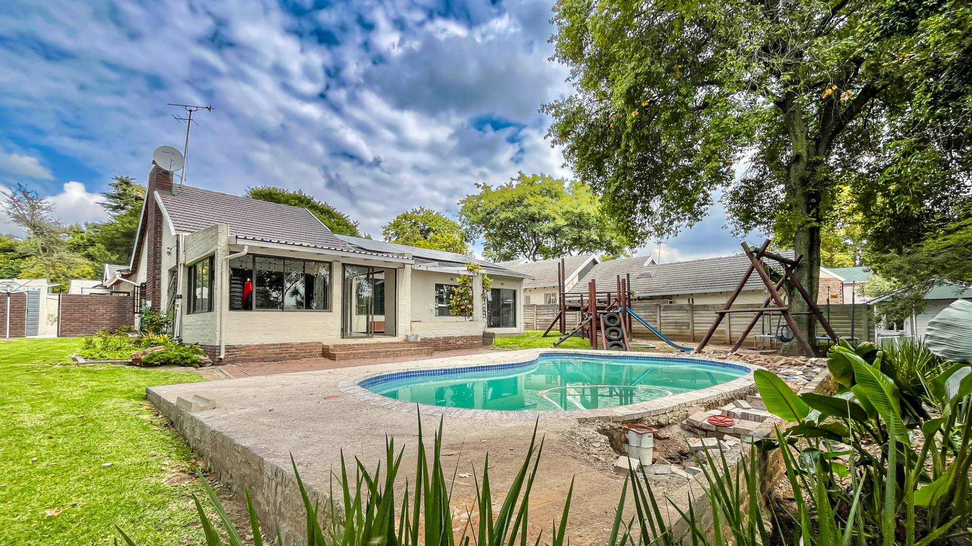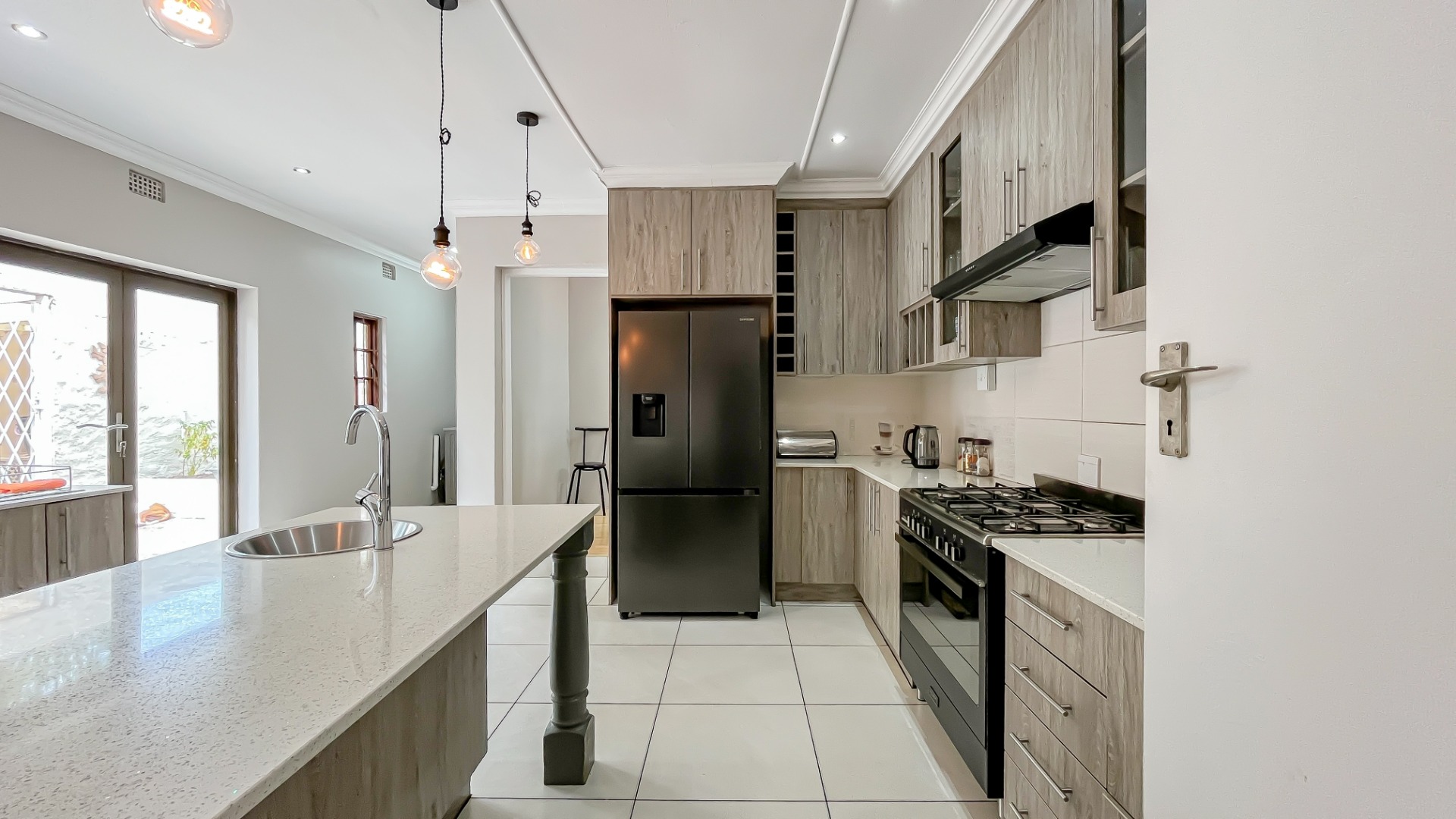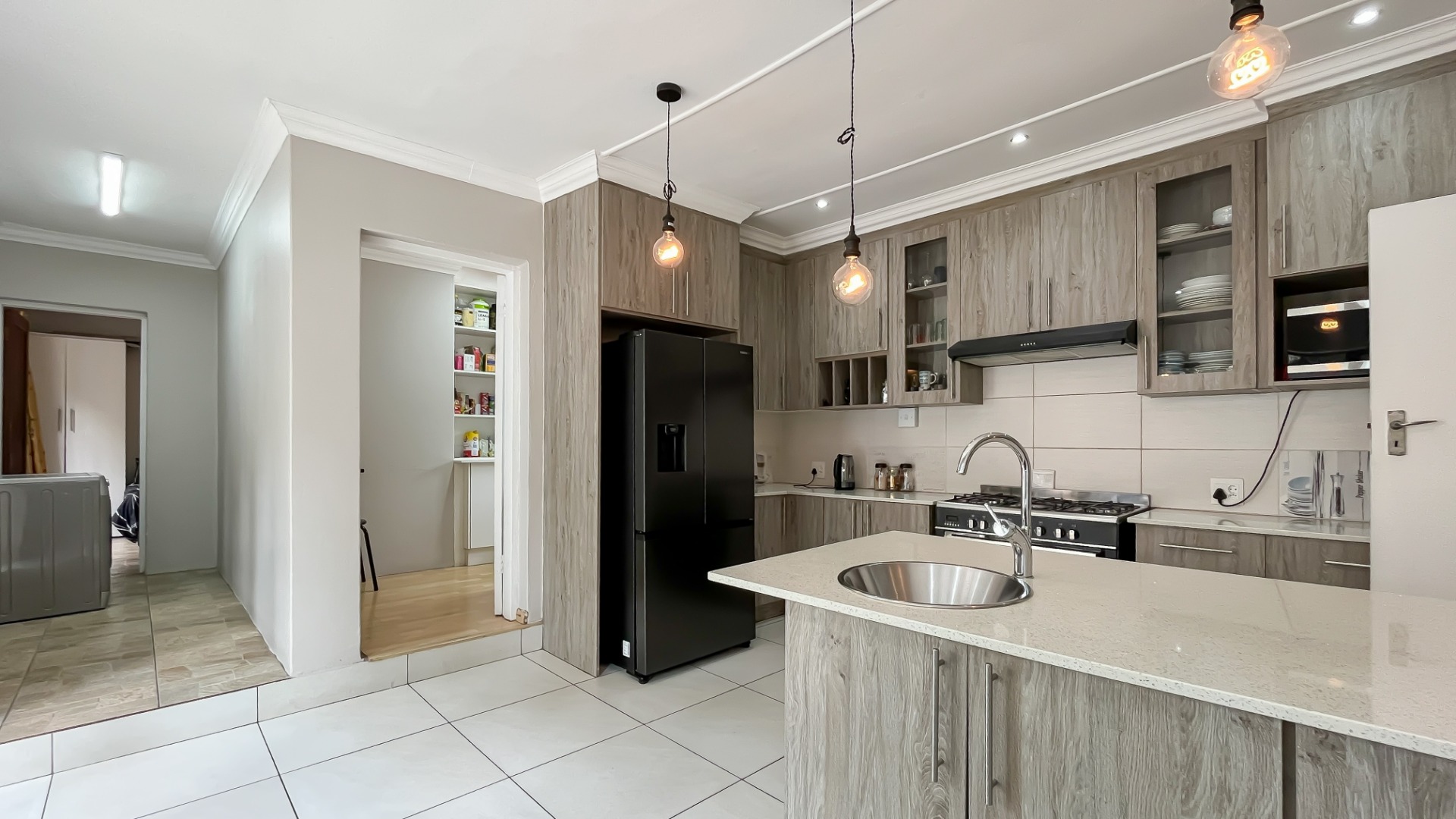 The kitchen is a true chef’s delight, featuring sleek stone countertops, a gas hob, electric oven, pantry, generous cupboard space, and a dedicated laundry area. Just off the lounge, a large sunroom or enclosed patio offers a serene retreat overlooking a sparkling pool—ideal for year-round entertaining.