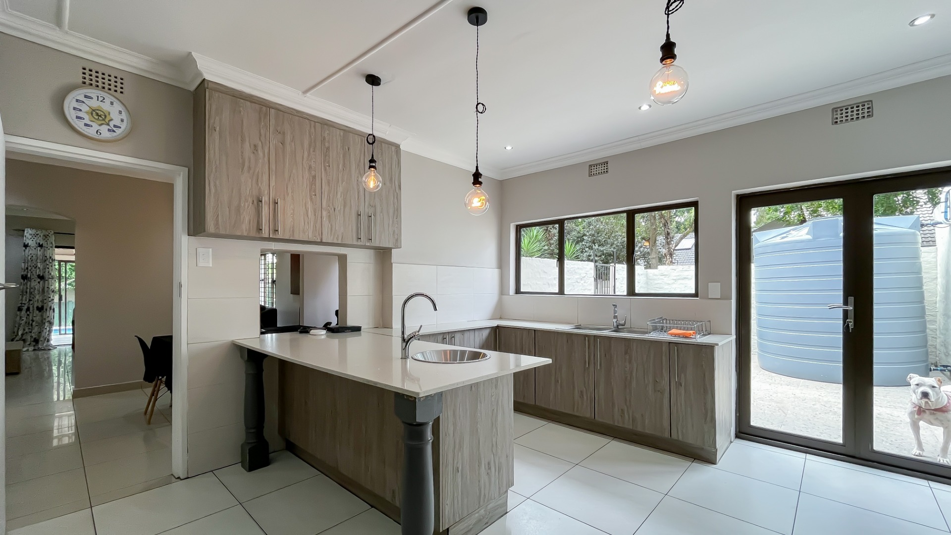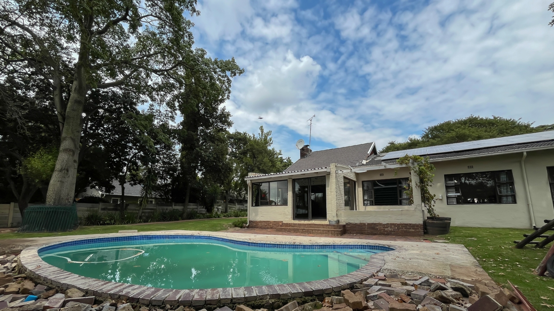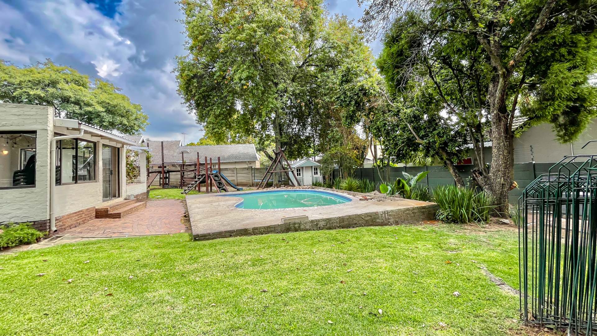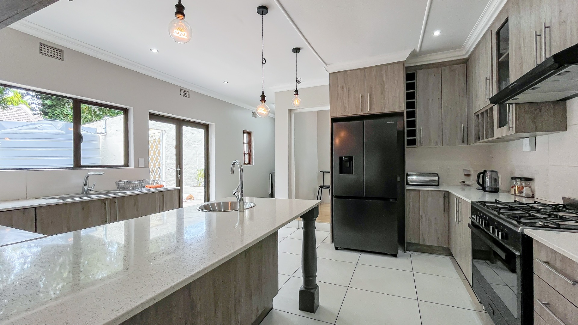 The kitchen is a true chef’s delight, featuring sleek stone countertops, a gas hob, electric oven, pantry, generous cupboard space, and a dedicated laundry area. Just off the lounge, a large sunroom or enclosed patio offers a serene retreat overlooking a sparkling pool—ideal for year-round entertaining.