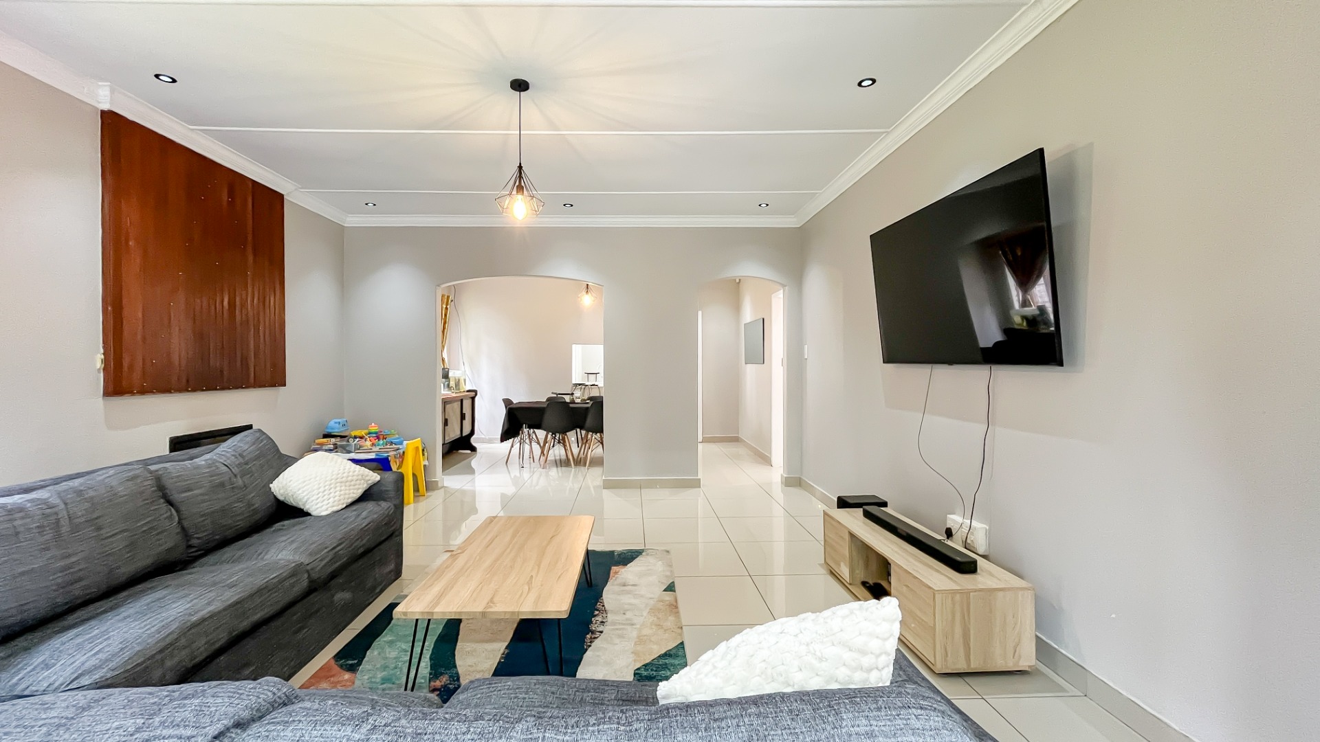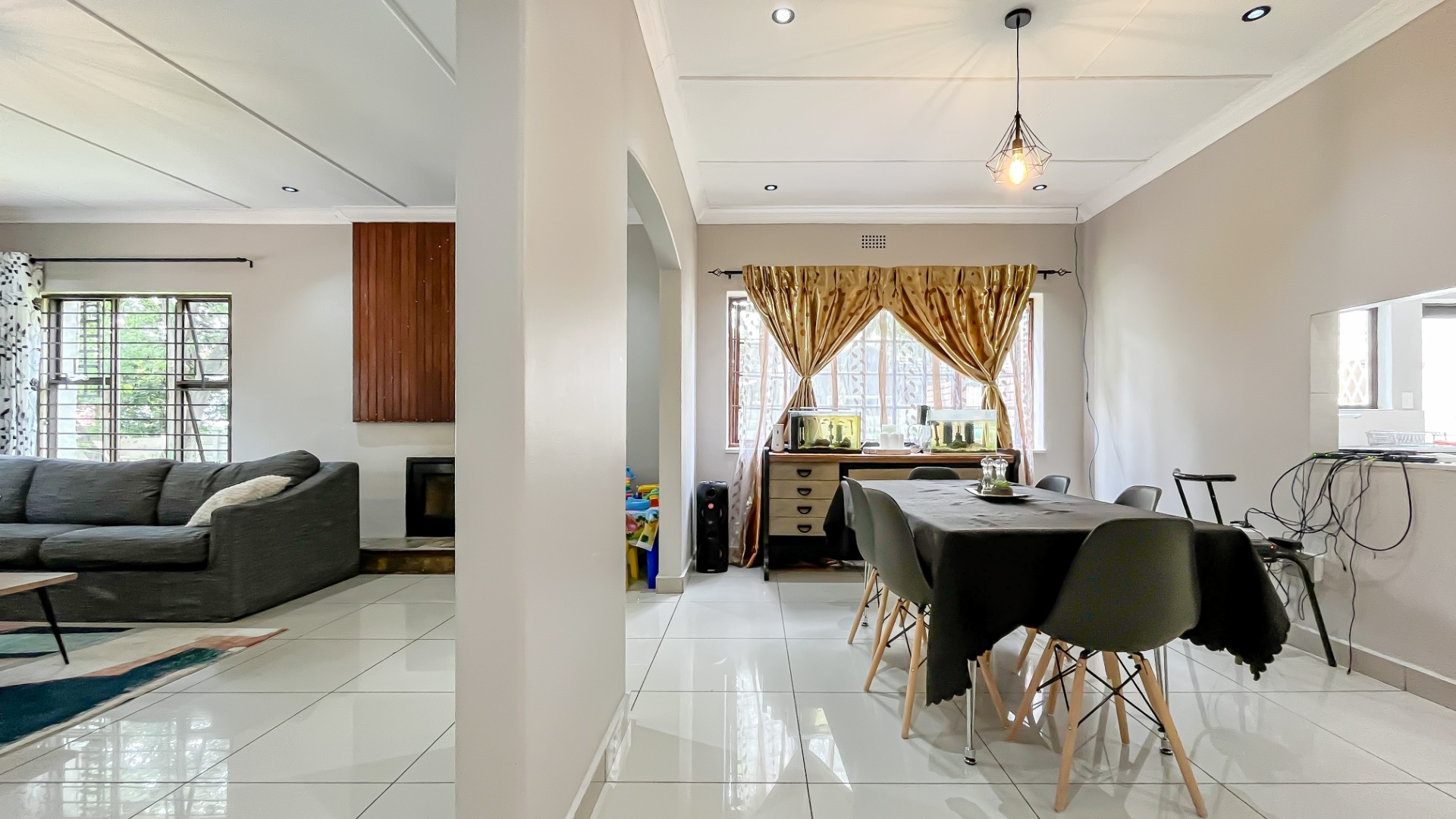 Step through the welcoming entrance hall and immediately appreciate the spacious, thoughtfully designed layout. The open-plan kitchen and dining area flow effortlessly into a warm and inviting lounge, complete with a charming fireplace and elegant chandeliers that add a touch of luxury—perfect for both relaxed evenings and entertaining guests.