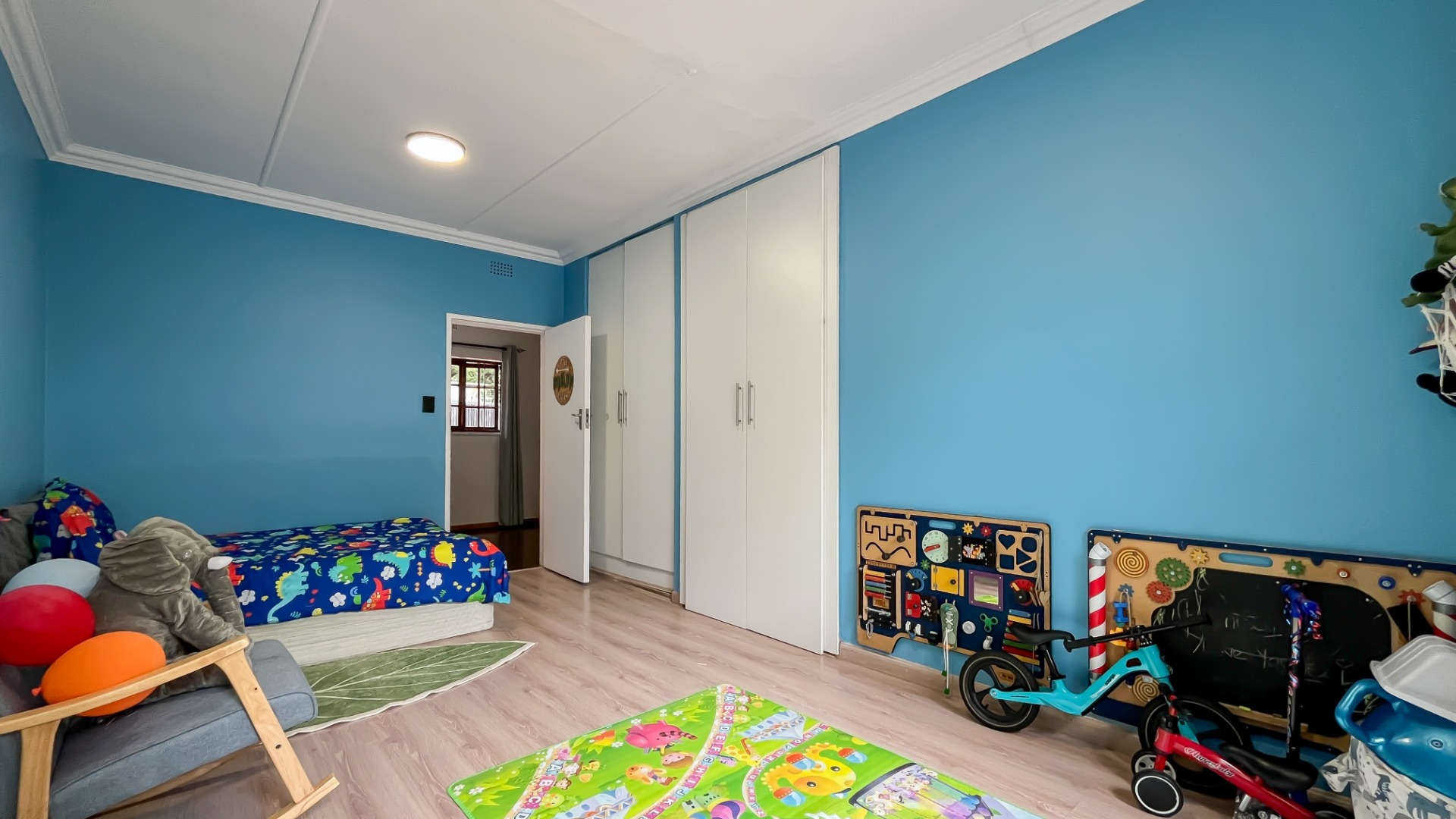 The main bedroom is a private sanctuary, boasting a full en suite bathroom, a walk-in closet, and a dedicated office space. A sliding door opens onto the garden, creating a peaceful escape. Two additional bedrooms are generously sized, sharing a full bathroom, while a cozy study nook for the children offers the perfect homework space.