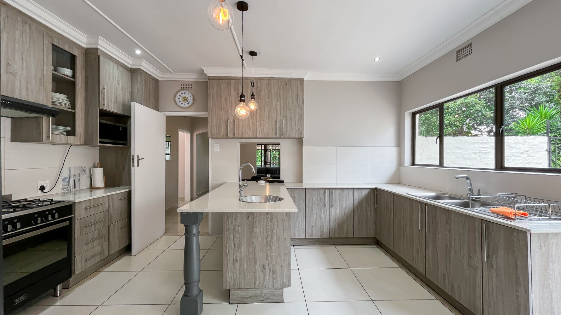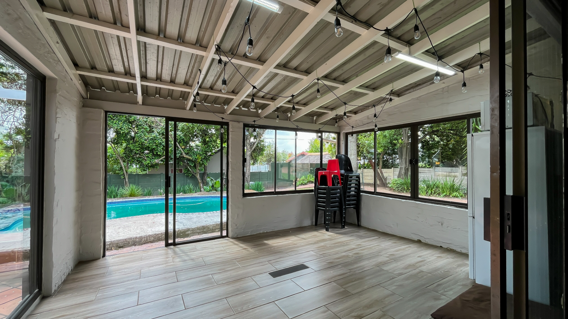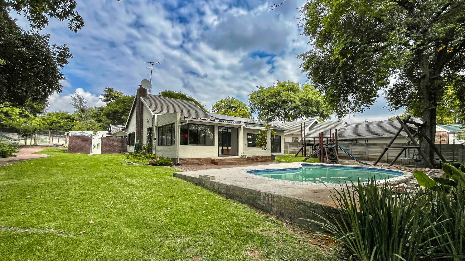 The kitchen is a true chef’s delight, featuring sleek stone countertops, a gas hob, electric oven, pantry, generous cupboard space, and a dedicated laundry area. Just off the lounge, a large sunroom or enclosed patio offers a serene retreat overlooking a sparkling pool—ideal for year-round entertaining.