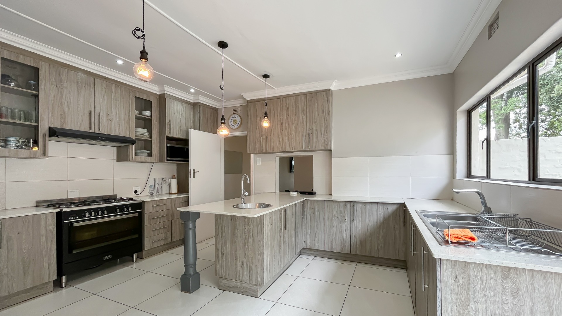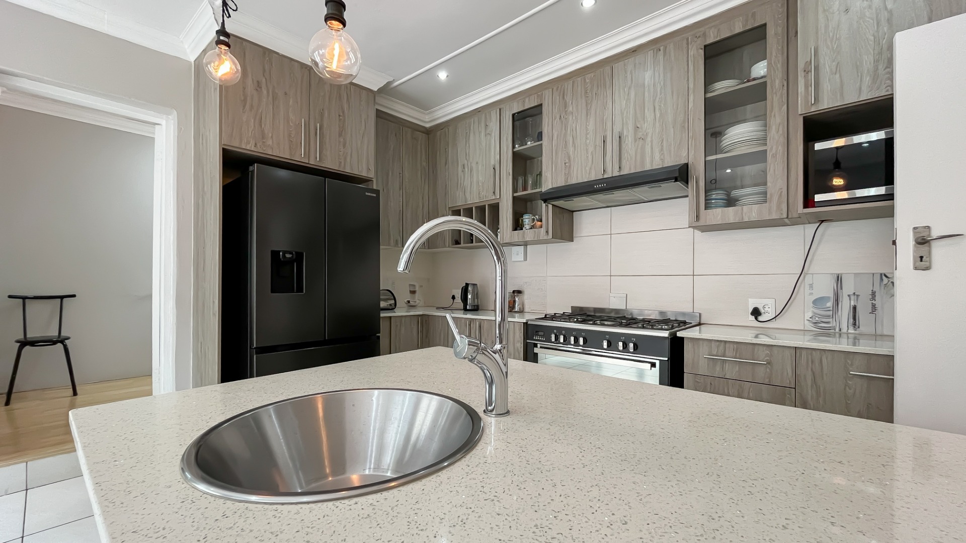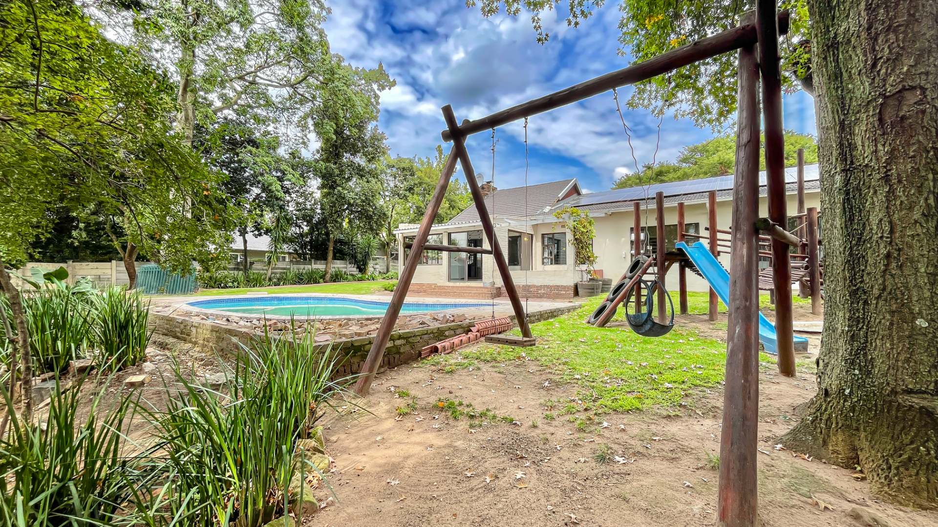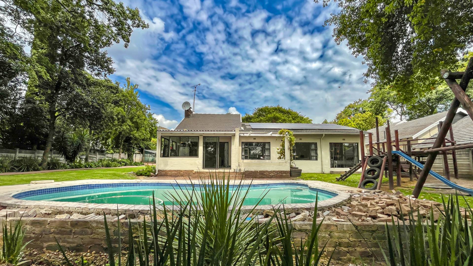 The kitchen is a true chef’s delight, featuring sleek stone countertops, a gas hob, electric oven, pantry, generous cupboard space, and a dedicated laundry area. Just off the lounge, a large sunroom or enclosed patio offers a serene retreat overlooking a sparkling pool—ideal for year-round entertaining.