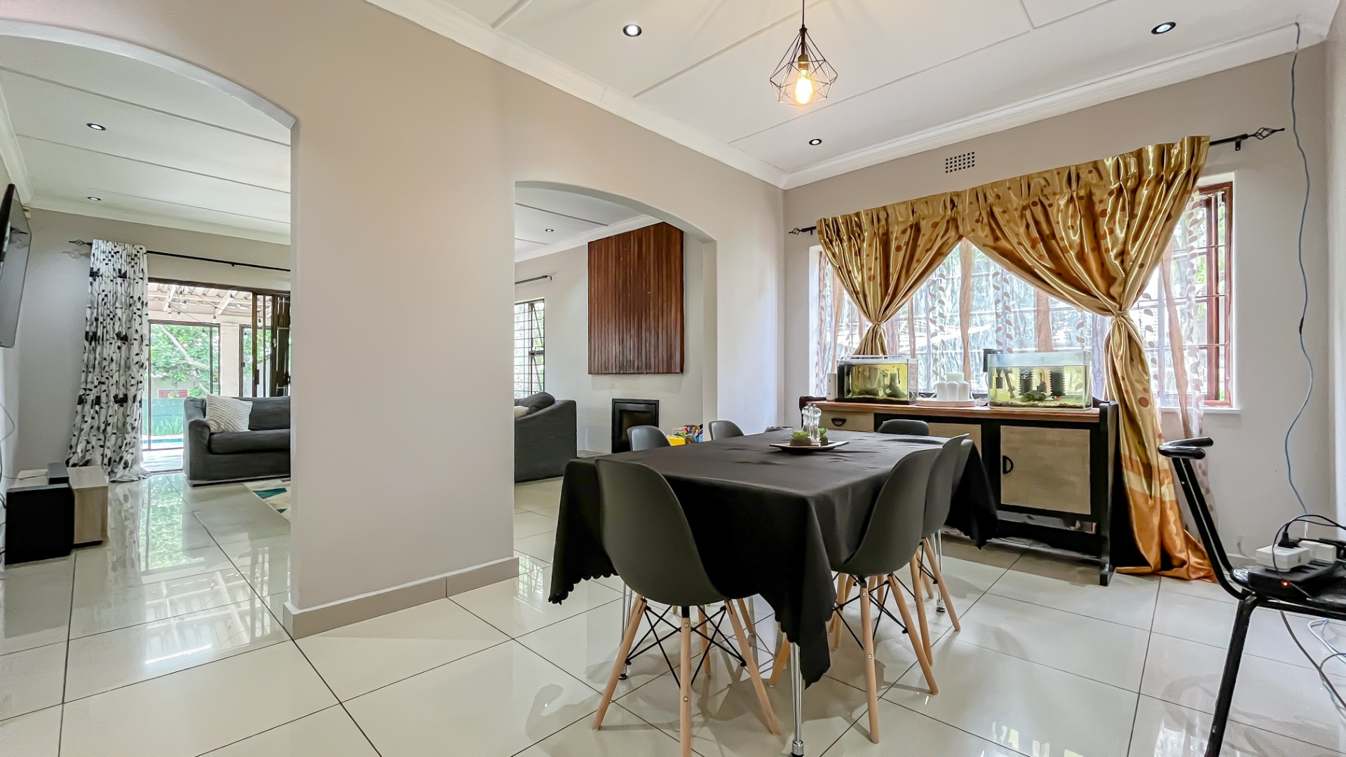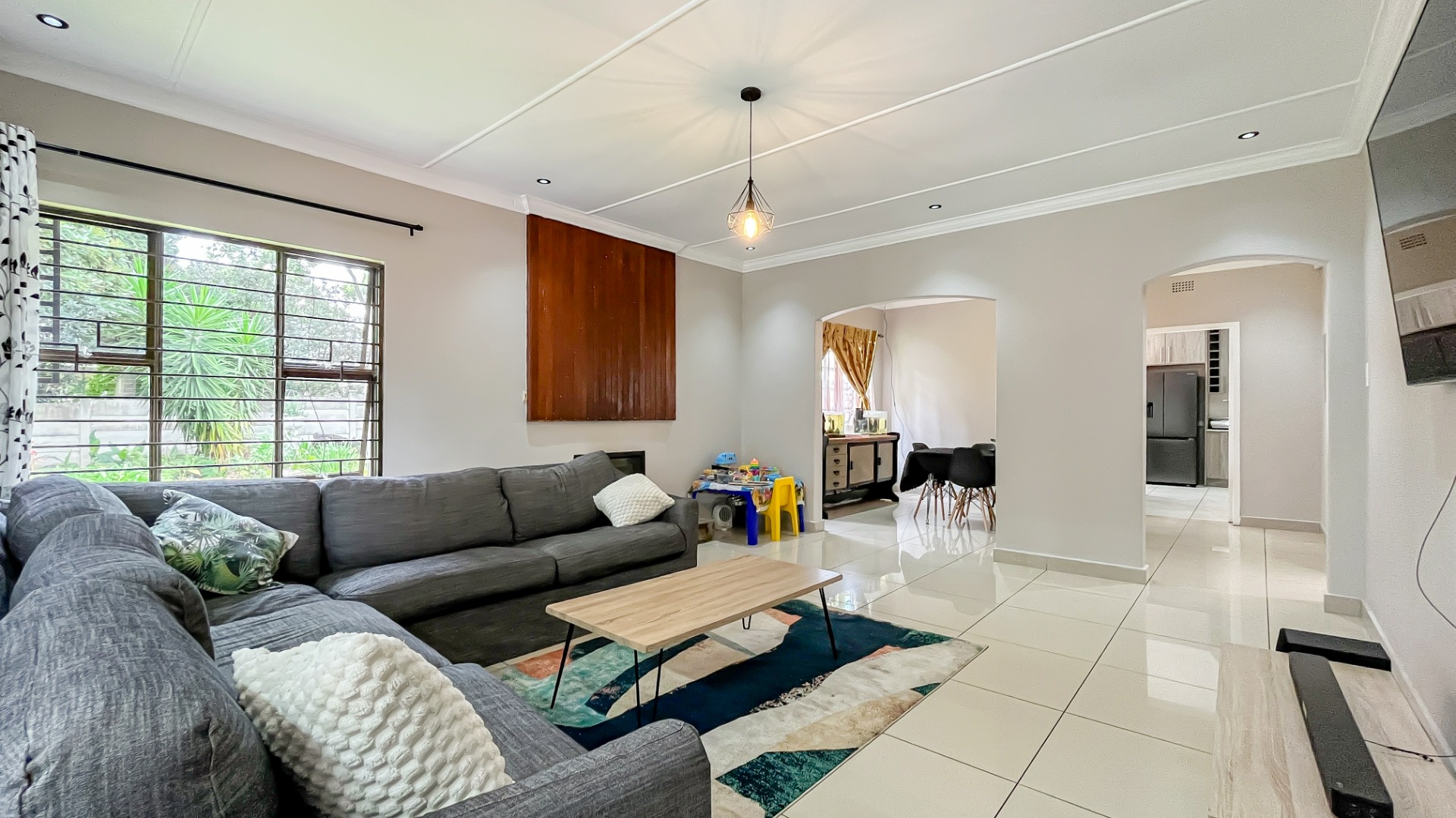 Step through the welcoming entrance hall and immediately appreciate the spacious, thoughtfully designed layout. The open-plan kitchen and dining area flow effortlessly into a warm and inviting lounge, complete with a charming fireplace and elegant chandeliers that add a touch of luxury—perfect for both relaxed evenings and entertaining guests.