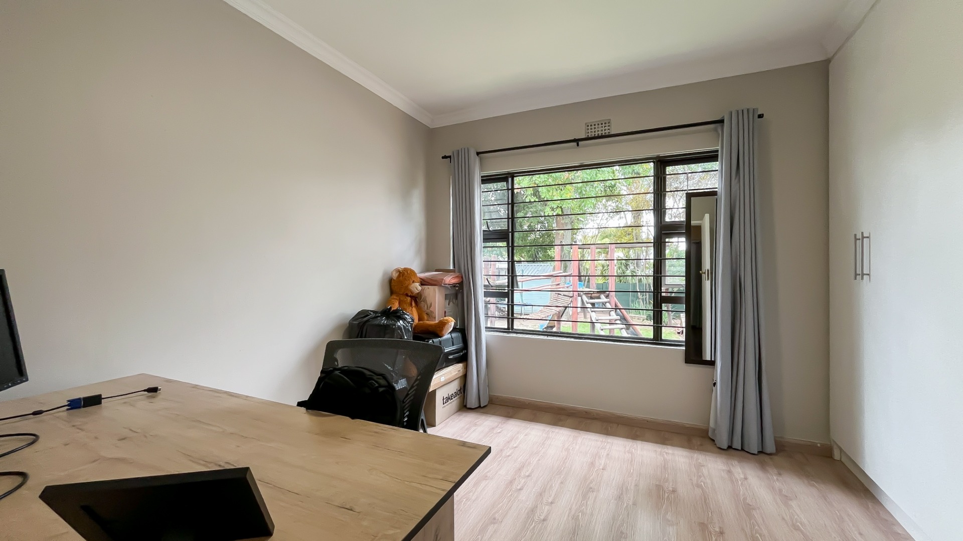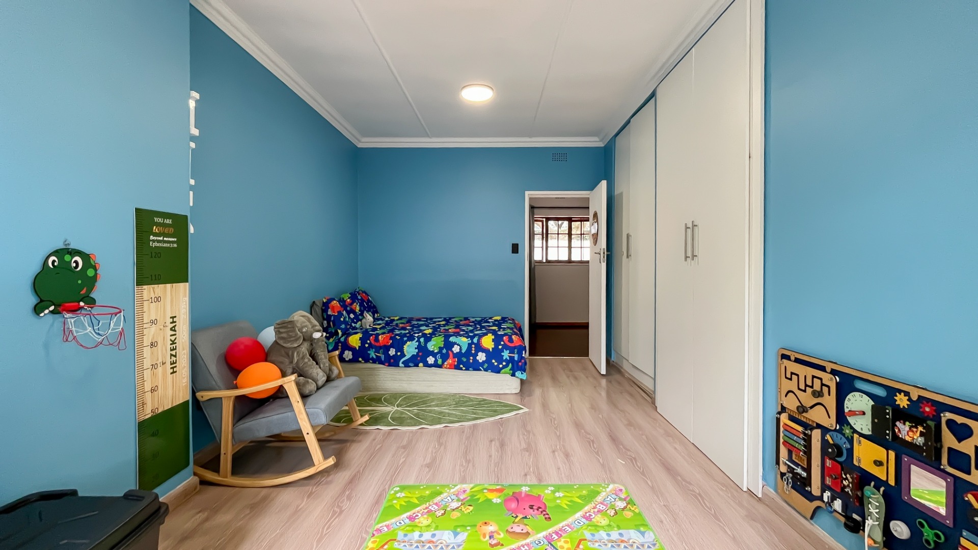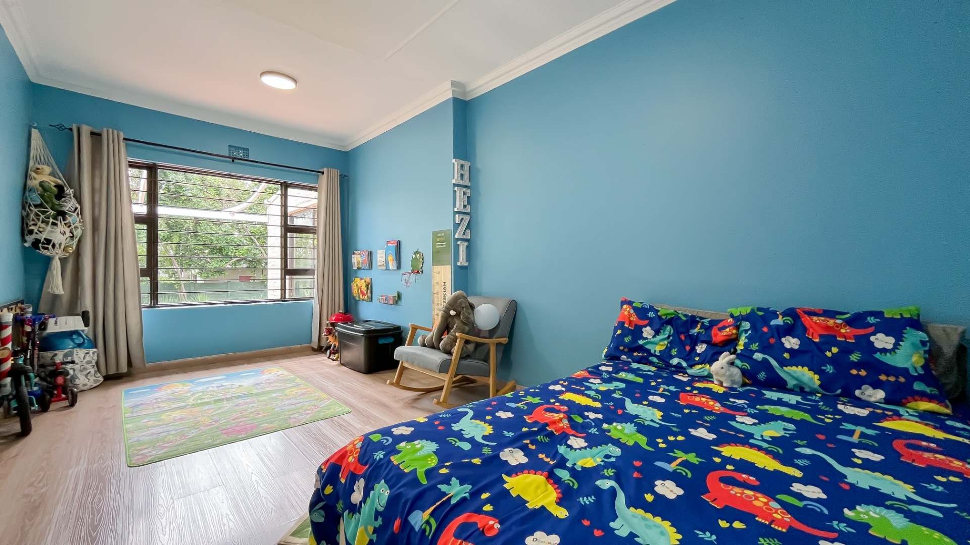 The main bedroom is a private sanctuary, boasting a full en suite bathroom, a walk-in closet, and a dedicated office space. A sliding door opens onto the garden, creating a peaceful escape. Two additional bedrooms are generously sized, sharing a full bathroom, while a cozy study nook for the children offers the perfect homework space.