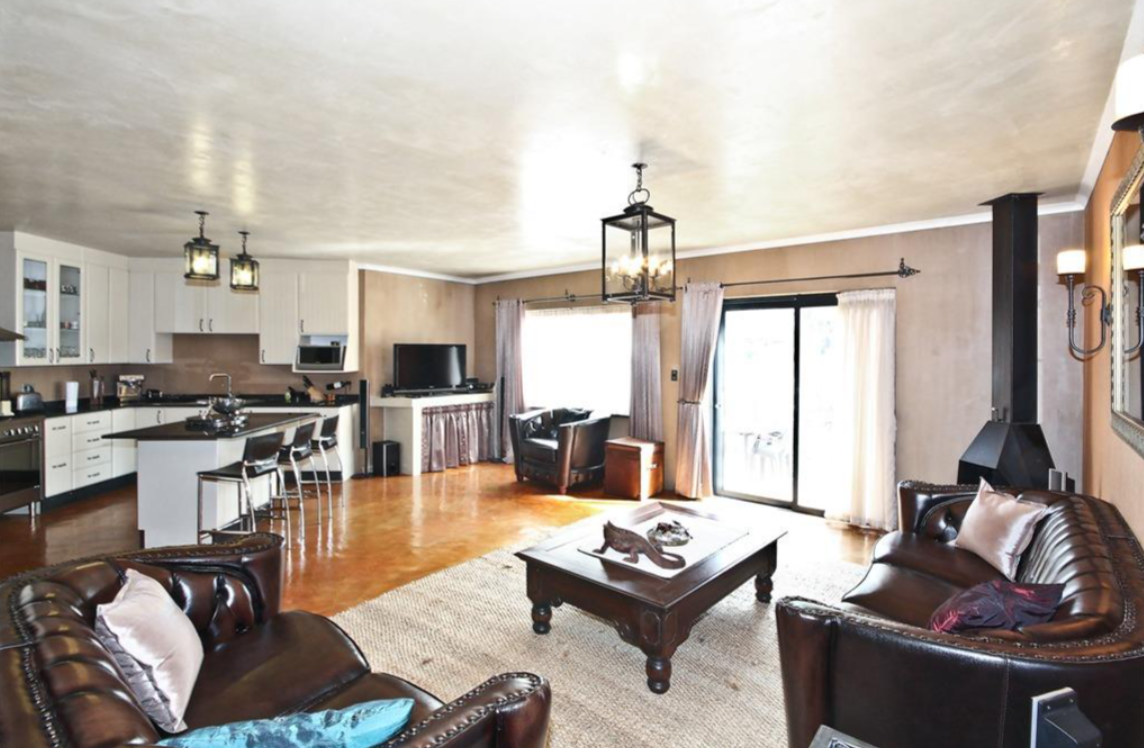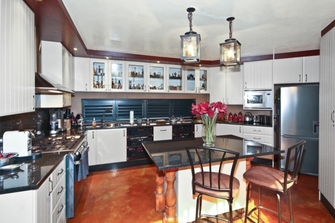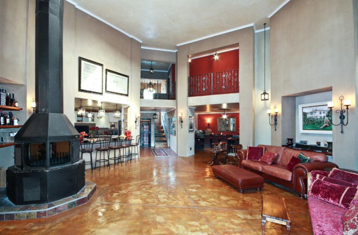 Step inside to discover an impressive open-plan layout featuring exceptionally high ceilings and polished concrete flooring that flows throughout the main living areas. A magnificent central fireplace serves as a focal point, complemented by an integrated bar area, perfect for entertaining. The home boasts three well-appointed kitchens, including one with a large granite island and bar seating, and another with modern white cabinetry and stainless steel appliances. A spacious dining room with a built-in serving counter provides an ideal setting for large gatherings, alongside a dedicated lounge and family TV room.