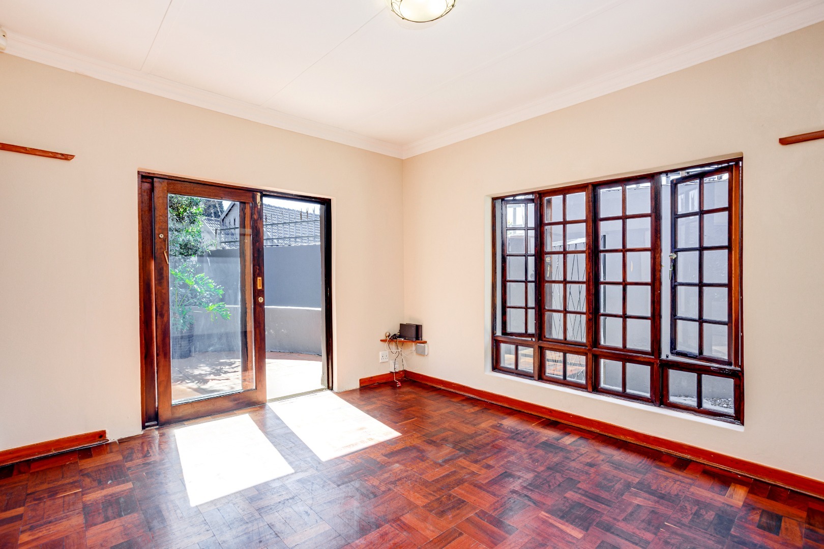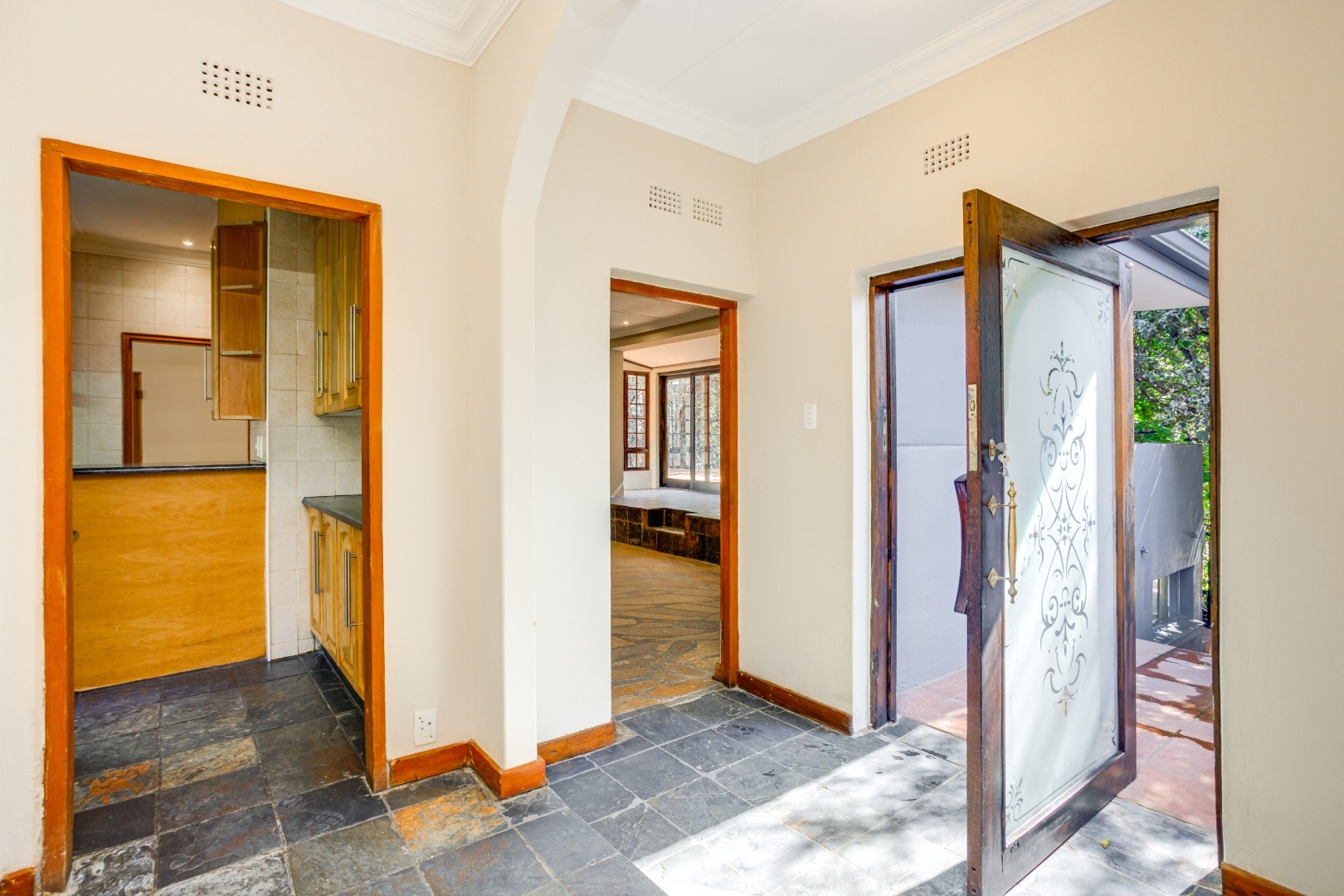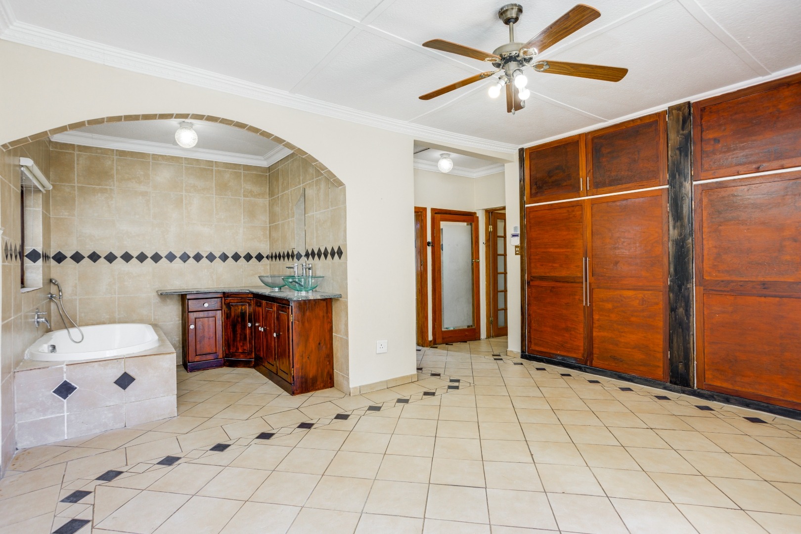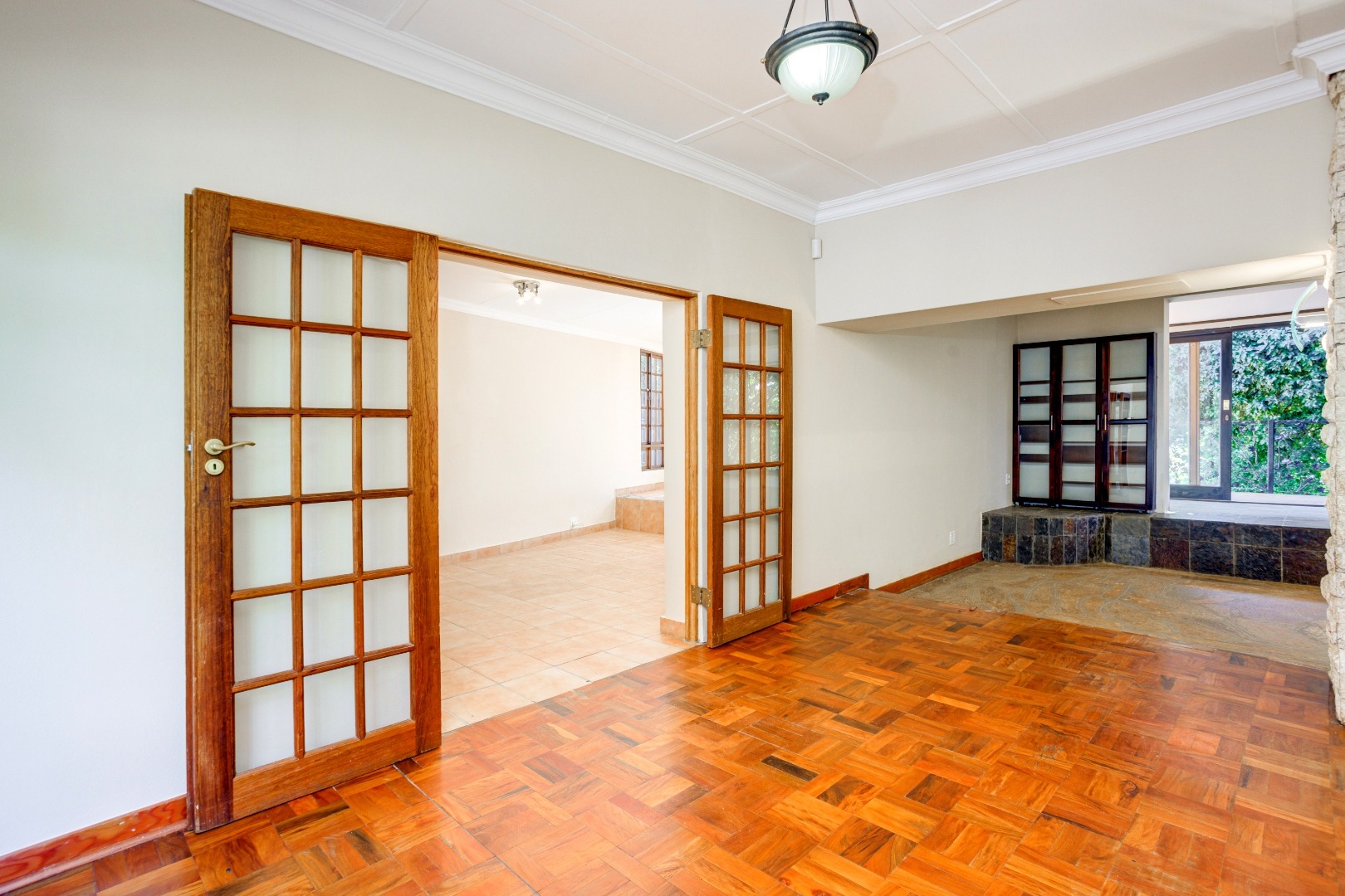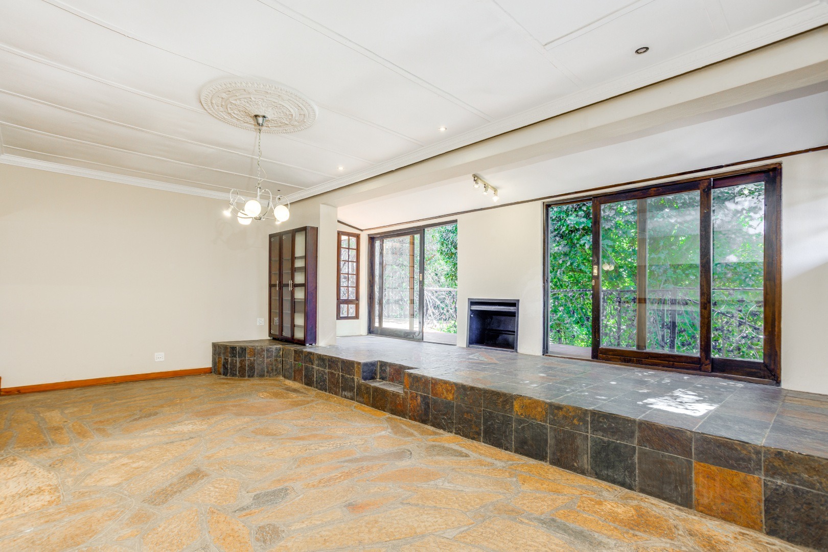 The dining room flows effortlessly into a sun-drenched playroom or entertainment room, which opens onto another patio complete with a built-in braai. This space is perfect for entertaining friends and family on warm summer evenings.