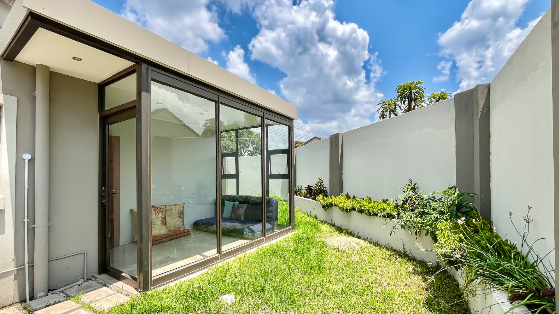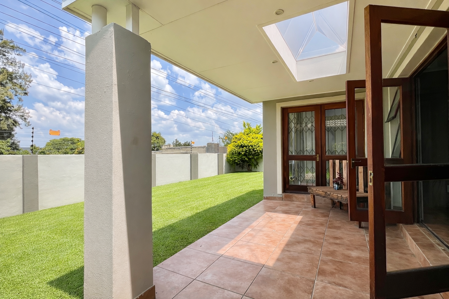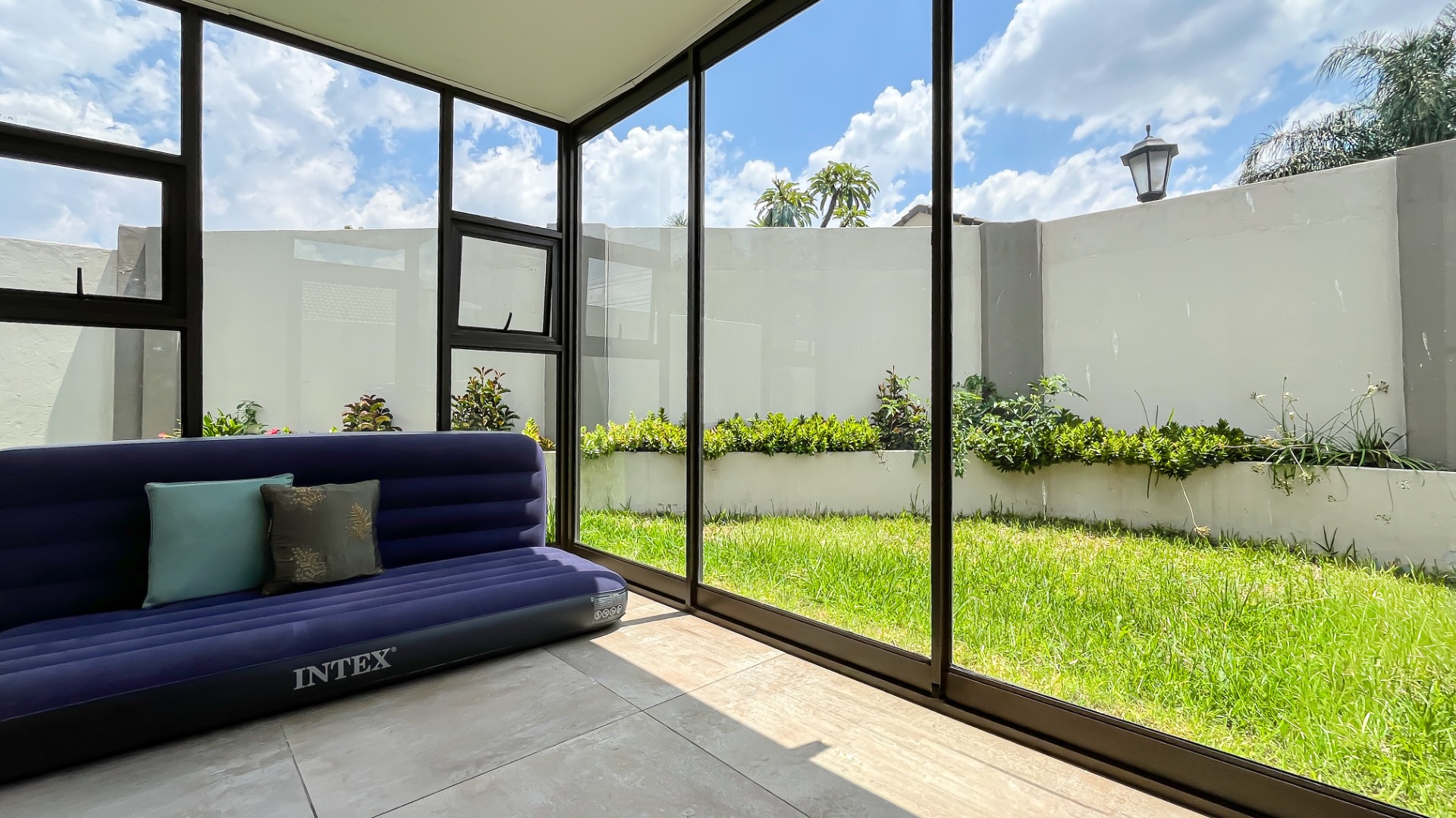 Sliding doors open onto a delightful covered patio overlooking a generously sized, manicured garden, creating an inviting indoor-outdoor lifestyle ideal for all seasons.