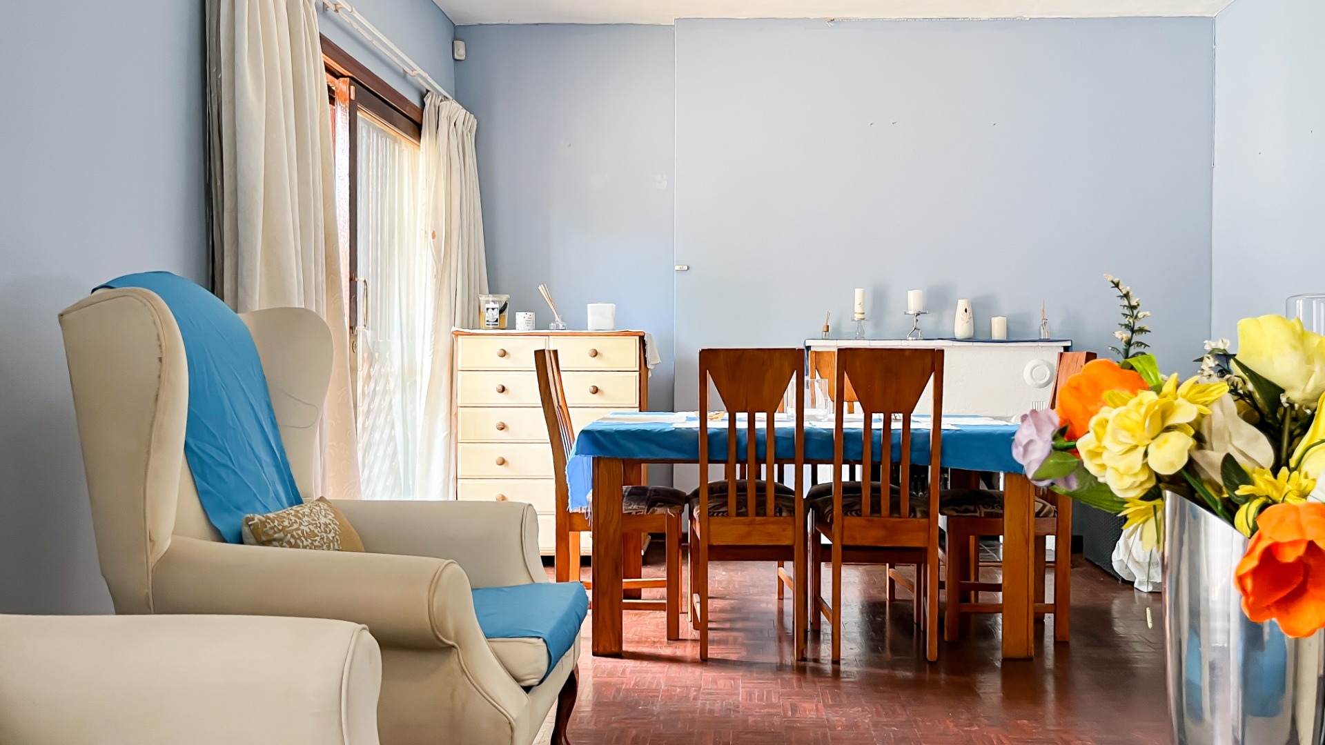 - Open plan lounge/dining room leading to a covered patio next to the pool