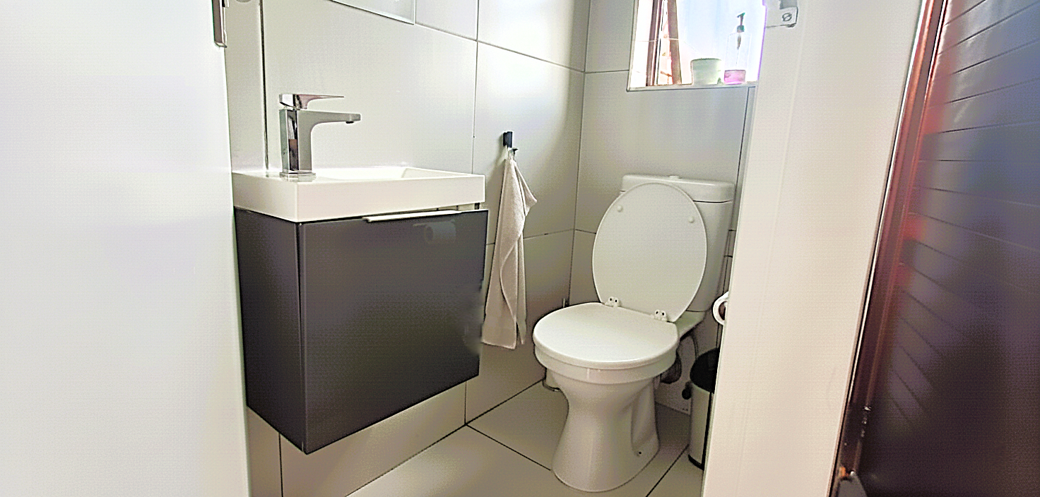 A separate Guest Cloakroom fitted with a toilet, basin, and vanity.