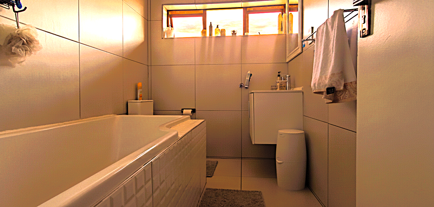 Generously sized, tiled, and fitted with built-in cupboards plus an extra storage closet.