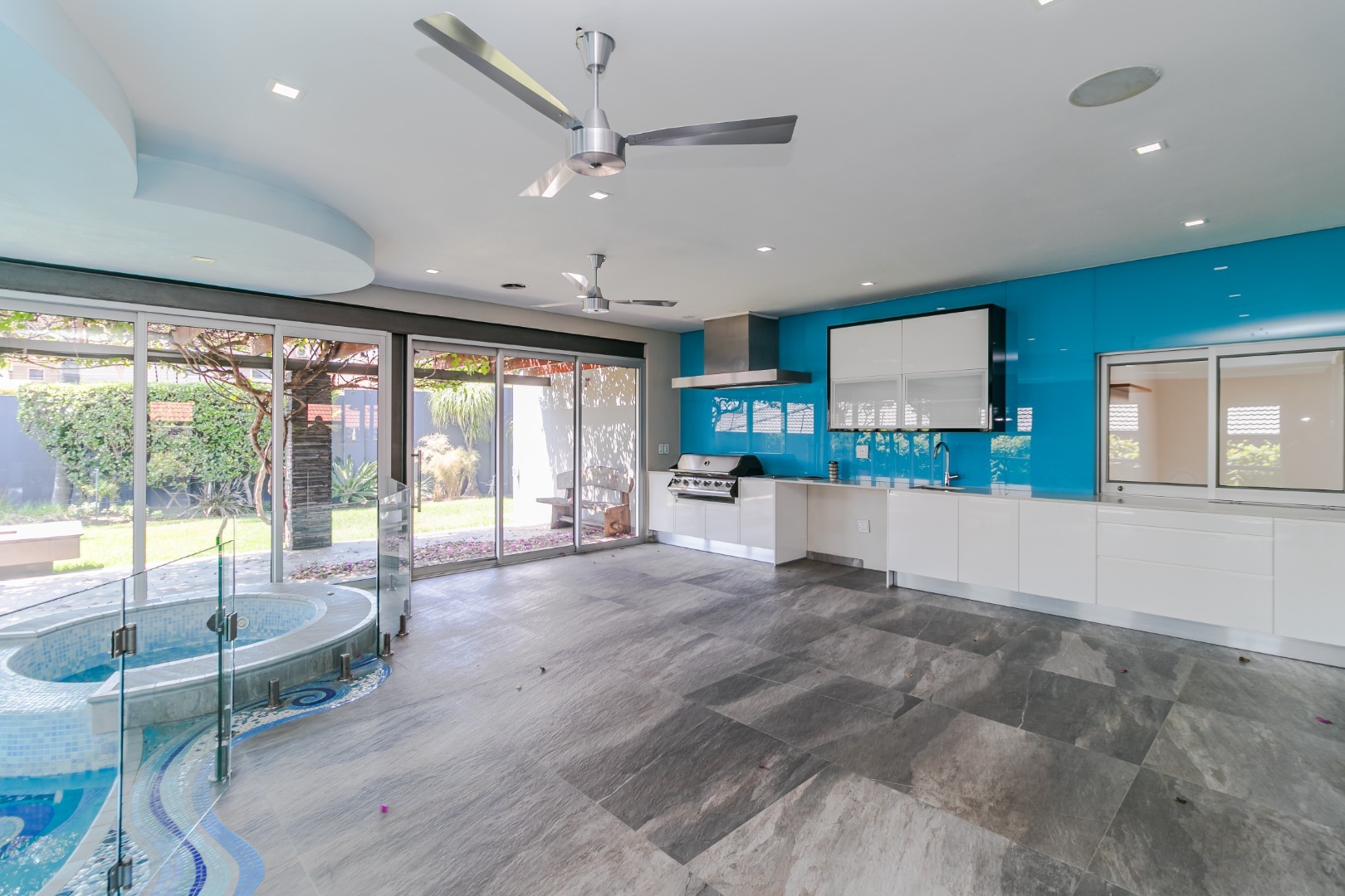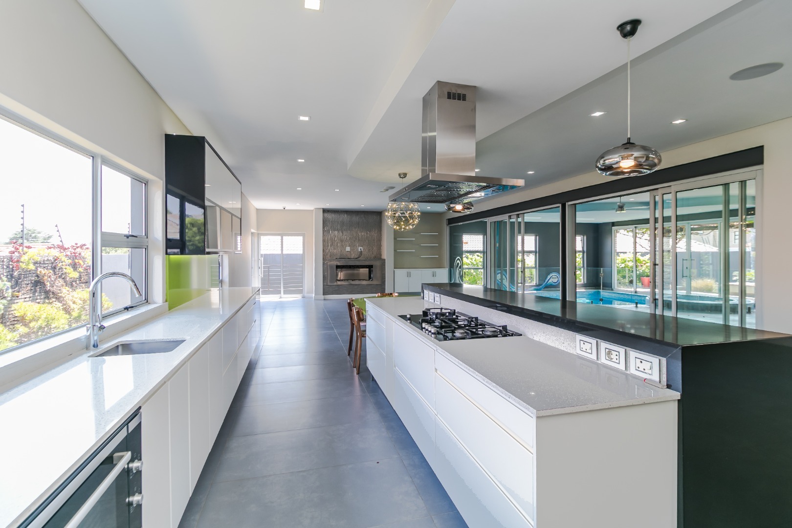 seamlessly connects to an entertainment area with an indoor braai, extractor, and