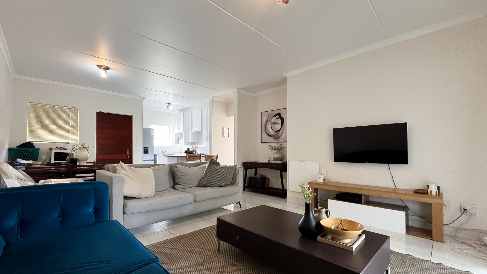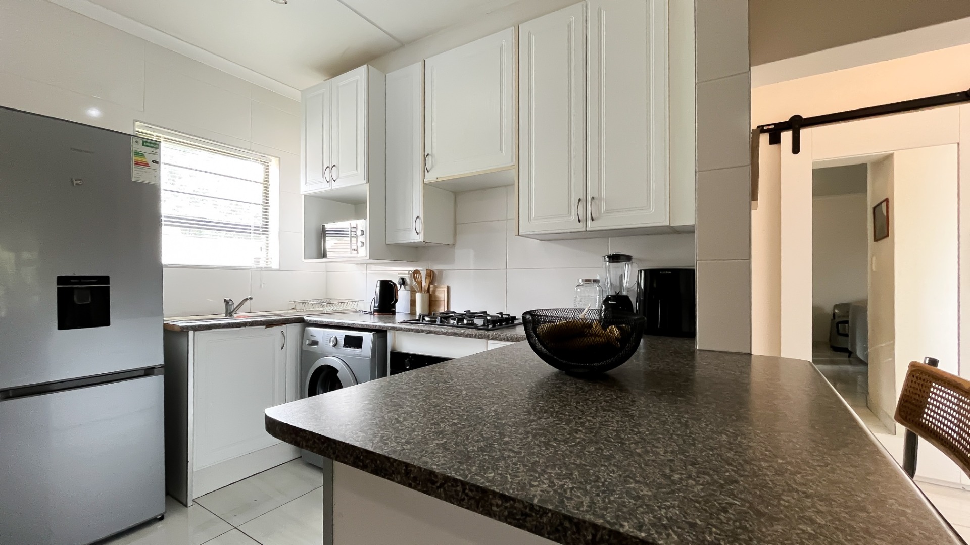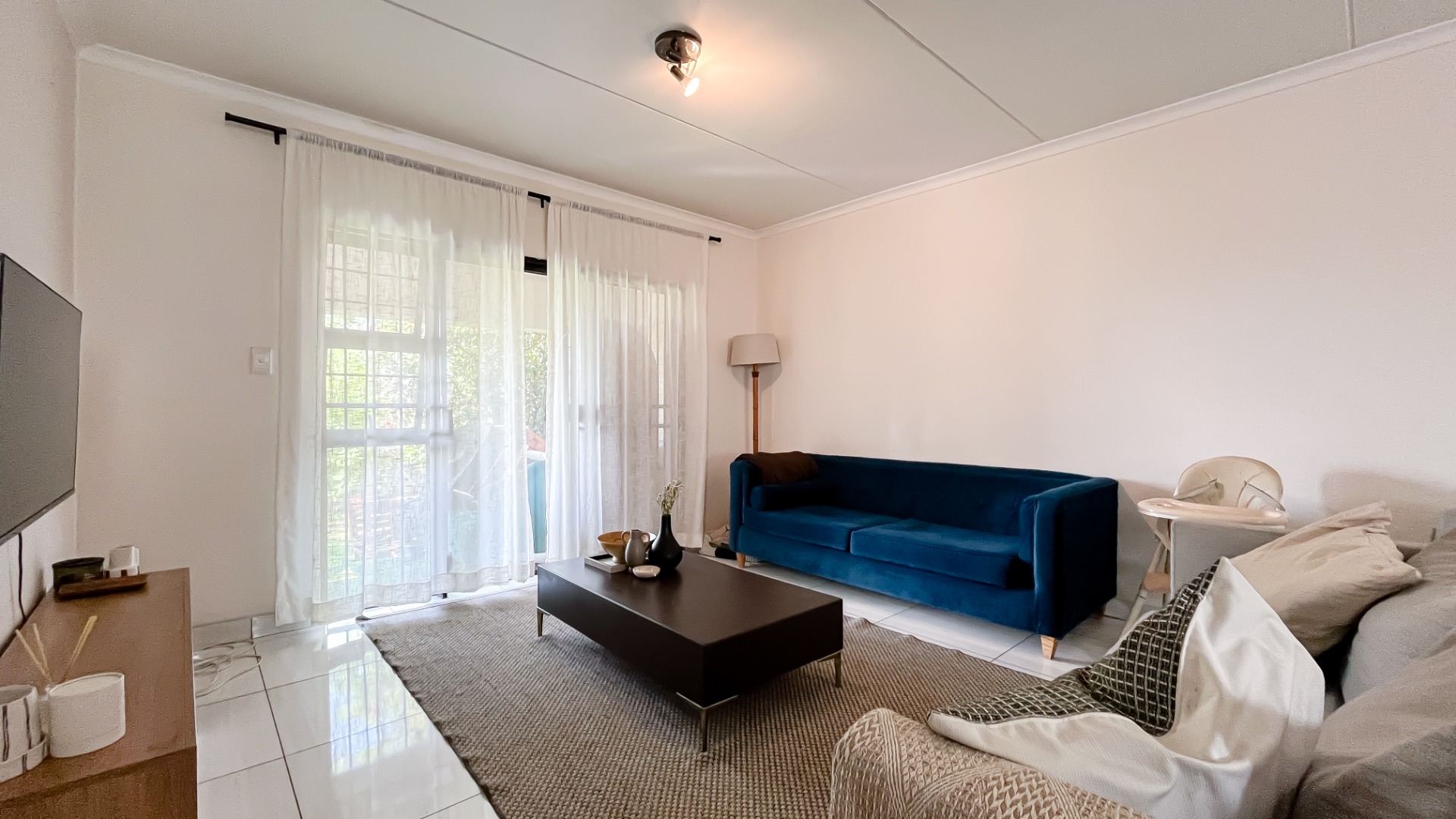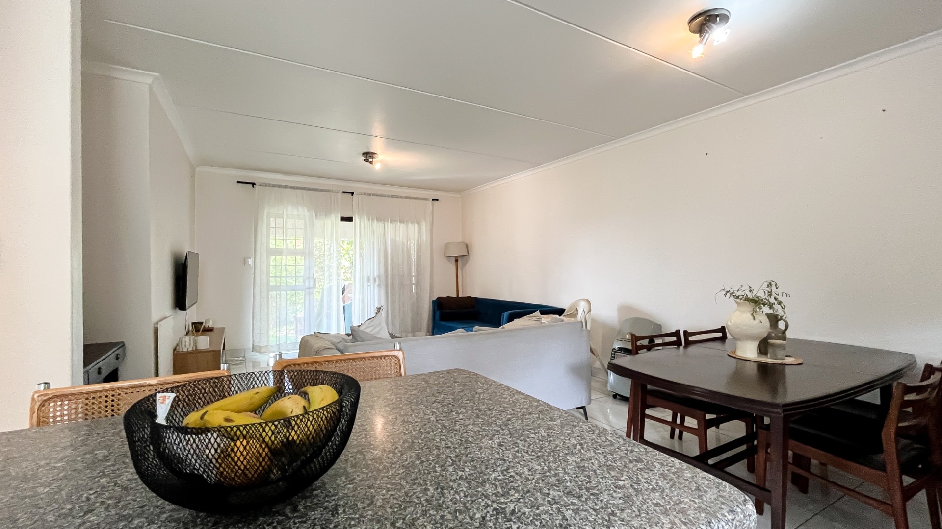 Discover modern living in this inviting 76 sqm residence located in a sought-after Paulshof complex. The property boasts a seamless open-plan layout, integrating the lounge, dining area, and kitchen into a bright, cohesive space. Crisp white walls and contemporary tiled flooring create a clean aesthetic, complemented by elegant crown molding. The modern kitchen is a highlight, featuring sleek white cabinetry, dark speckled countertops, a built-in oven, and a gas hob. A convenient breakfast bar offers casual dining, while an integrated washing machine adds to the functionality. Large sliding doors ensure abundant natural light fills the living areas, enhancing the sense of space and connection to the outdoors.