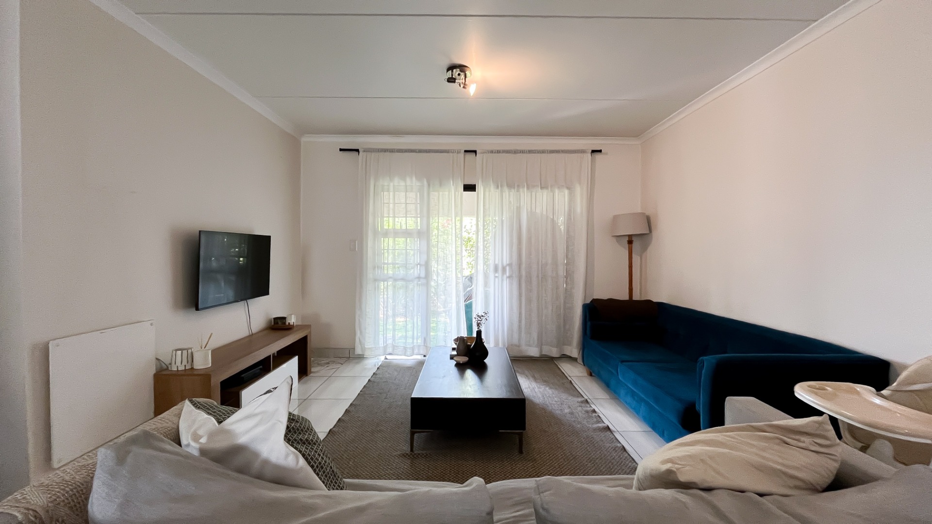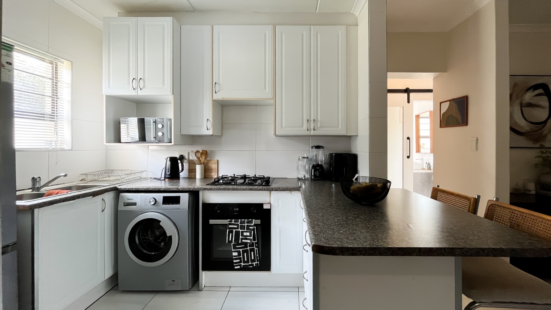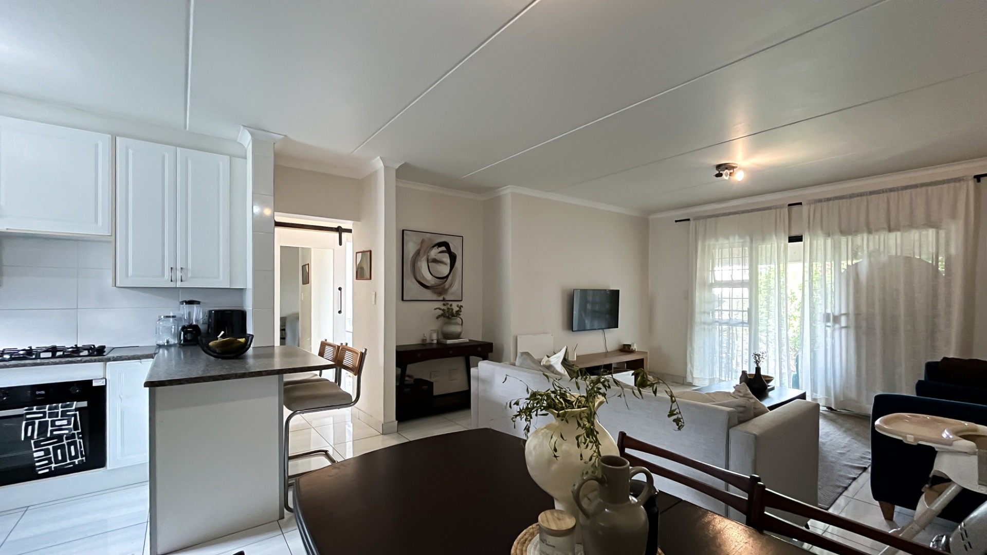 Discover modern living in this inviting 76 sqm residence located in a sought-after Paulshof complex. The property boasts a seamless open-plan layout, integrating the lounge, dining area, and kitchen into a bright, cohesive space. Crisp white walls and contemporary tiled flooring create a clean aesthetic, complemented by elegant crown molding. The modern kitchen is a highlight, featuring sleek white cabinetry, dark speckled countertops, a built-in oven, and a gas hob. A convenient breakfast bar offers casual dining, while an integrated washing machine adds to the functionality. Large sliding doors ensure abundant natural light fills the living areas, enhancing the sense of space and connection to the outdoors.
