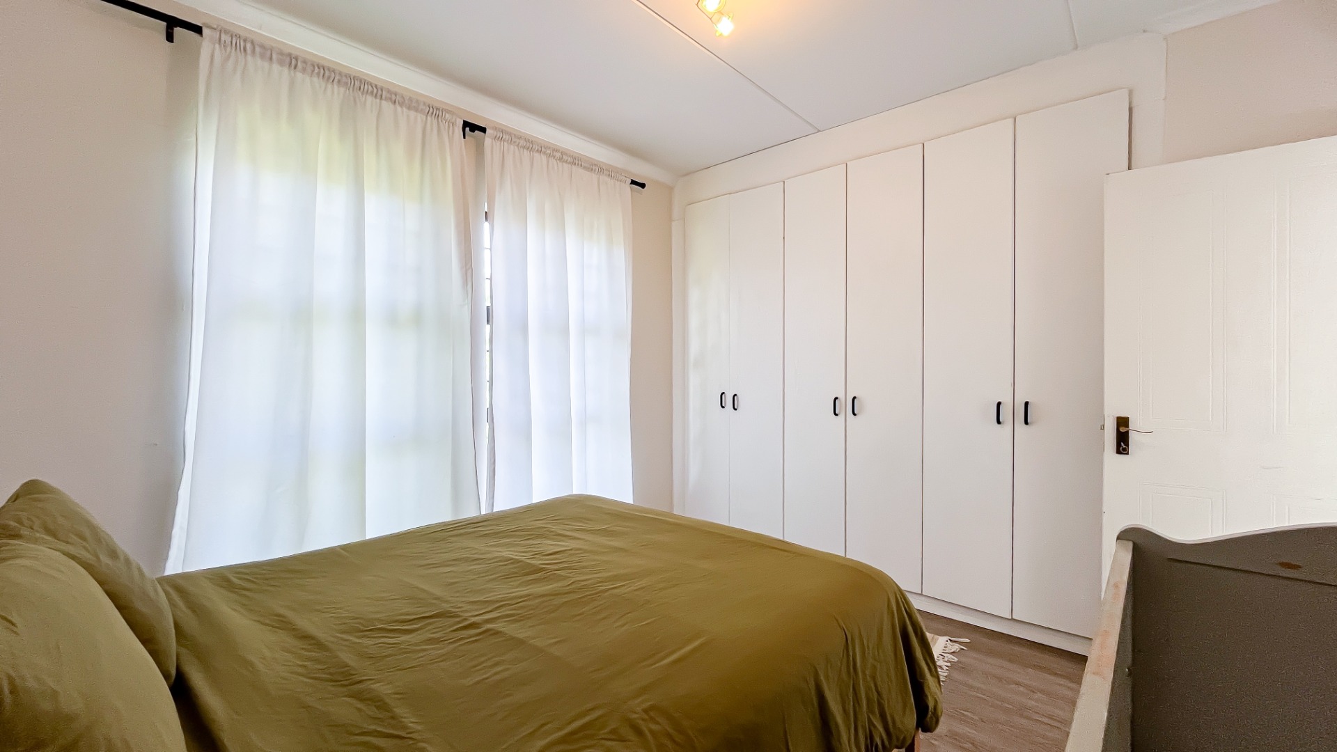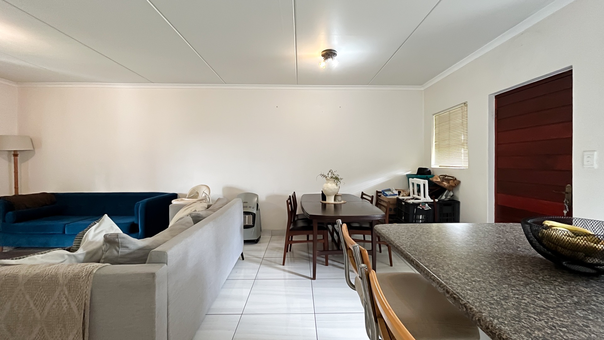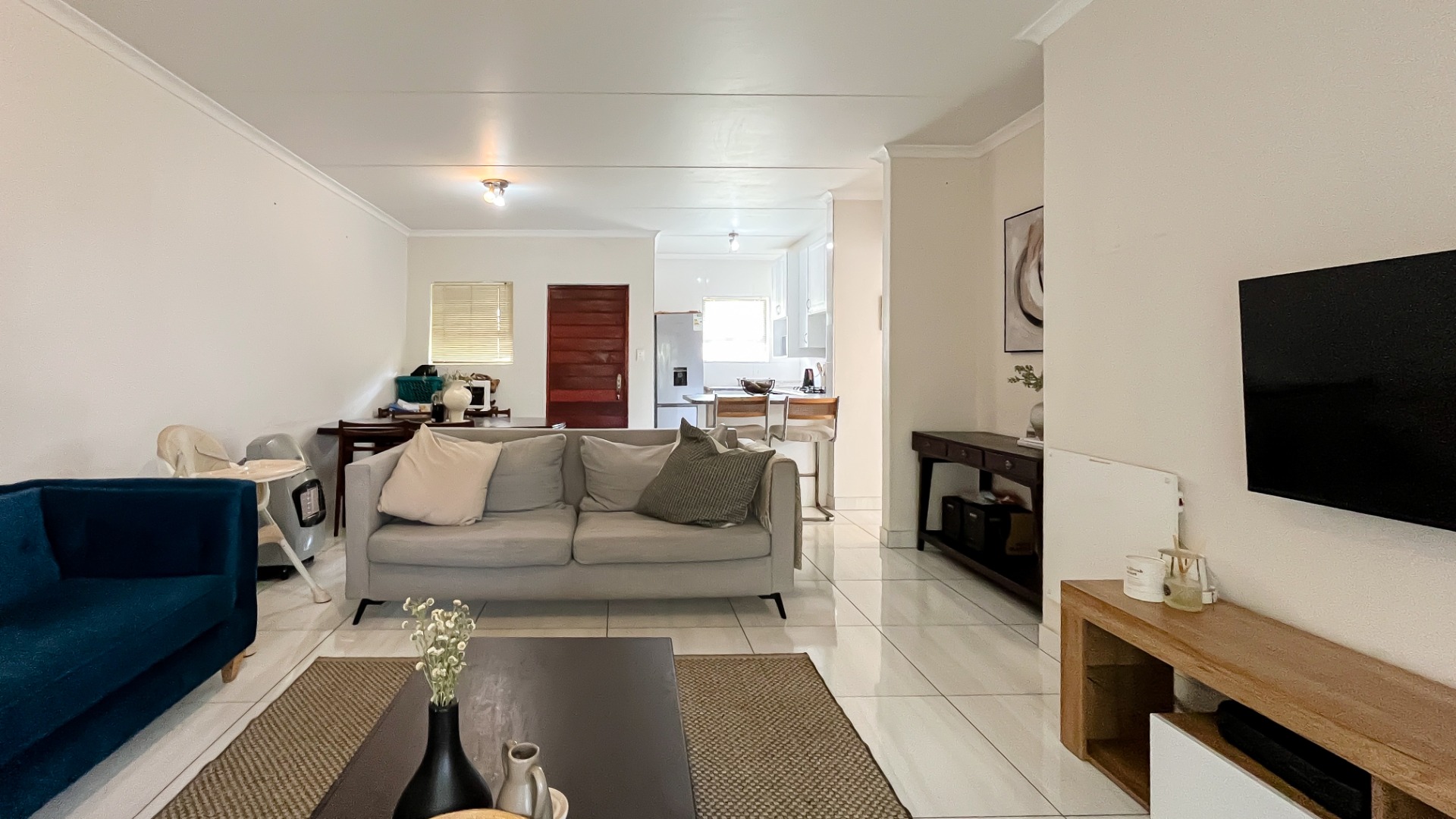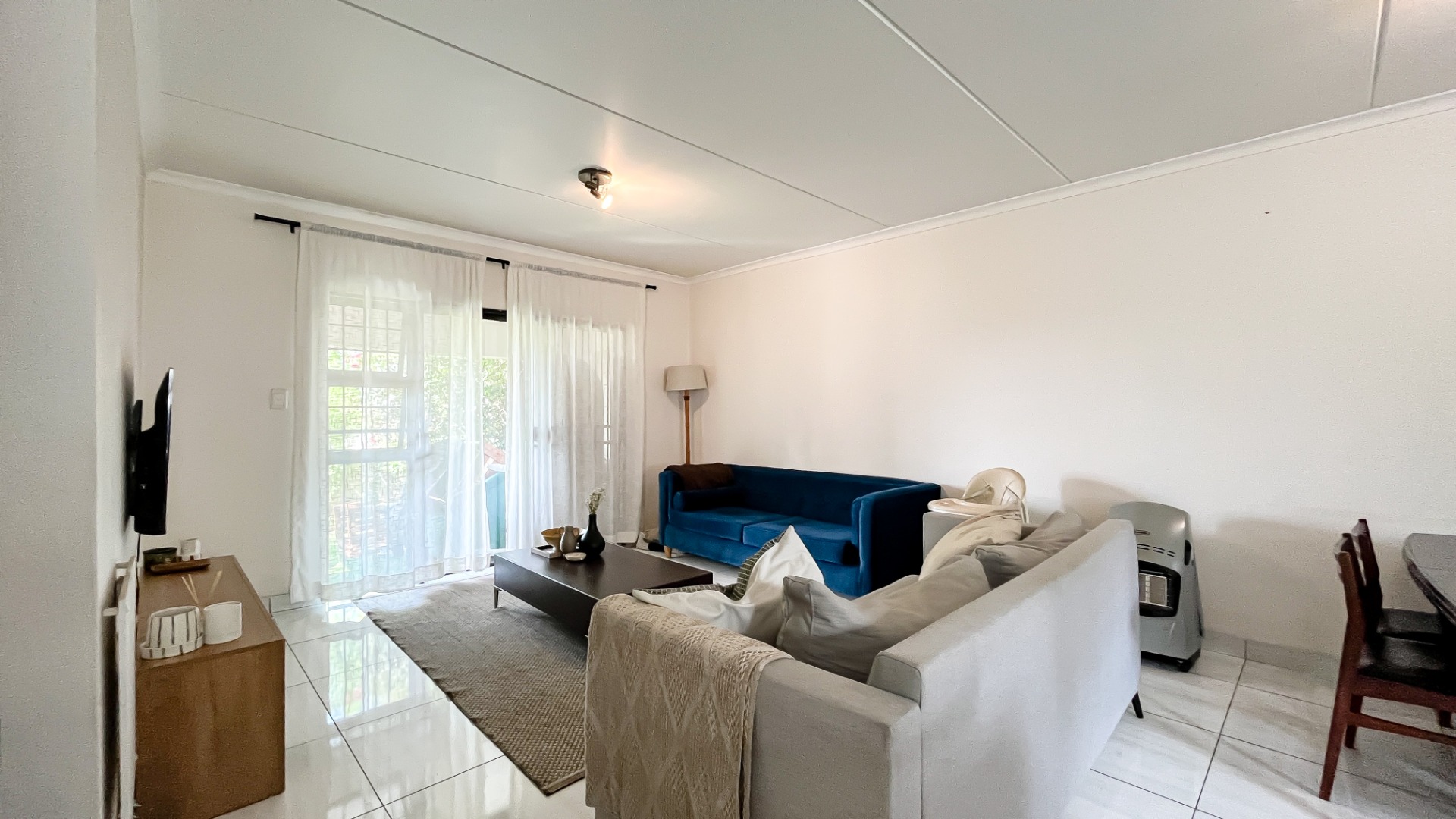 Discover modern living in this inviting 76 sqm residence located in a sought-after Paulshof complex. The property boasts a seamless open-plan layout, integrating the lounge, dining area, and kitchen into a bright, cohesive space. Crisp white walls and contemporary tiled flooring create a clean aesthetic, complemented by elegant crown molding. The modern kitchen is a highlight, featuring sleek white cabinetry, dark speckled countertops, a built-in oven, and a gas hob. A convenient breakfast bar offers casual dining, while an integrated washing machine adds to the functionality. Large sliding doors ensure abundant natural light fills the living areas, enhancing the sense of space and connection to the outdoors.