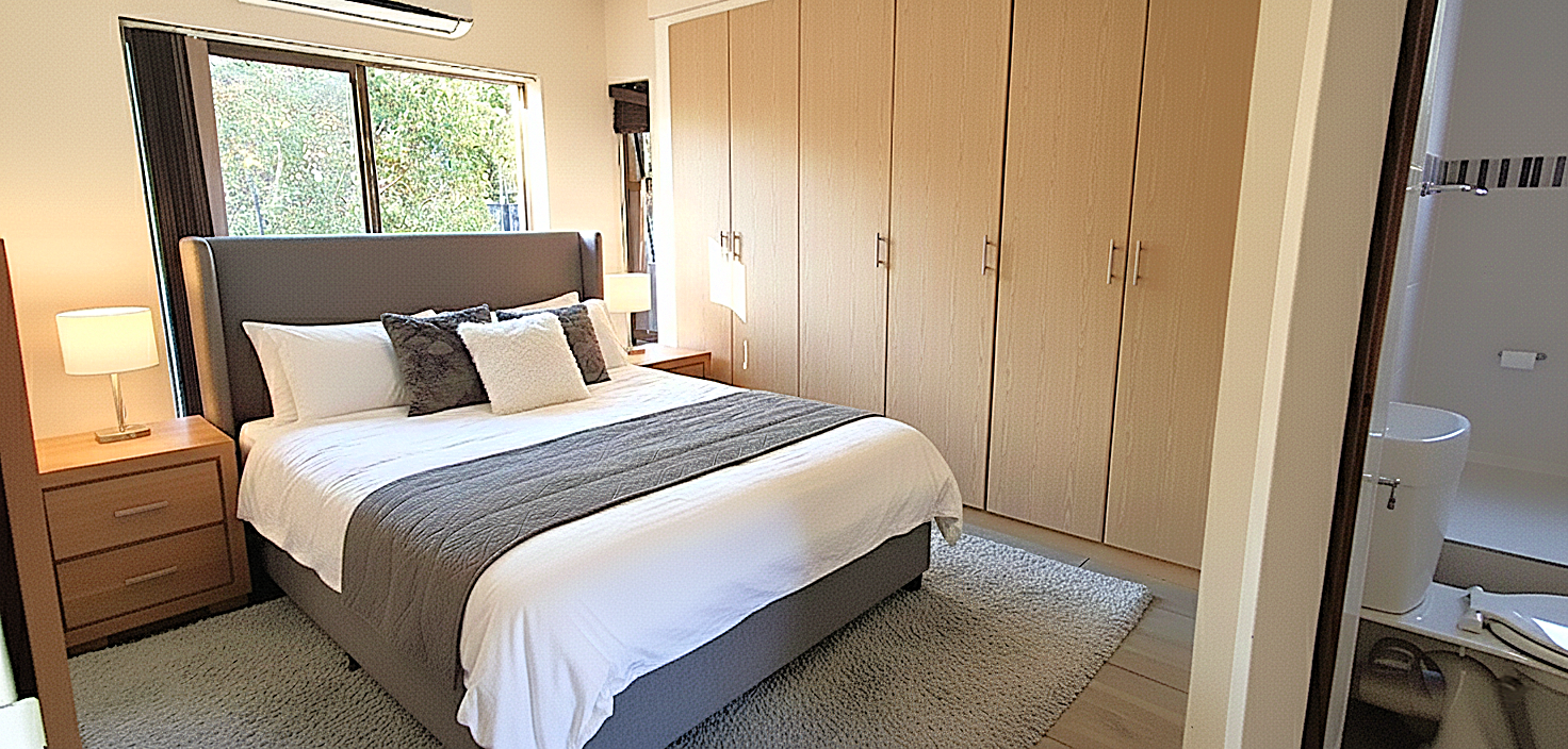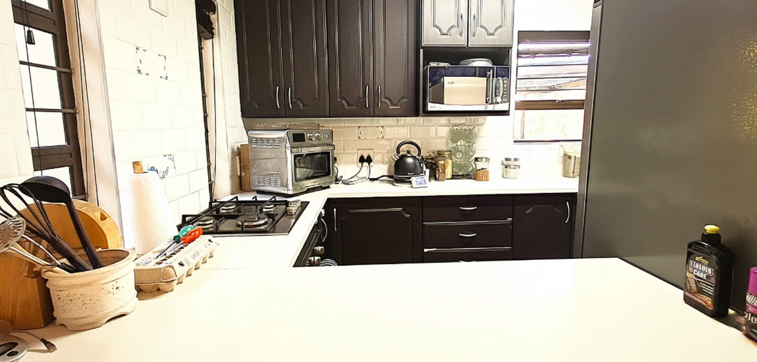 Chic Kitchen: Caesarstone countertops, Wooden Breakfast Nook, and a Gas Oven & Hob.