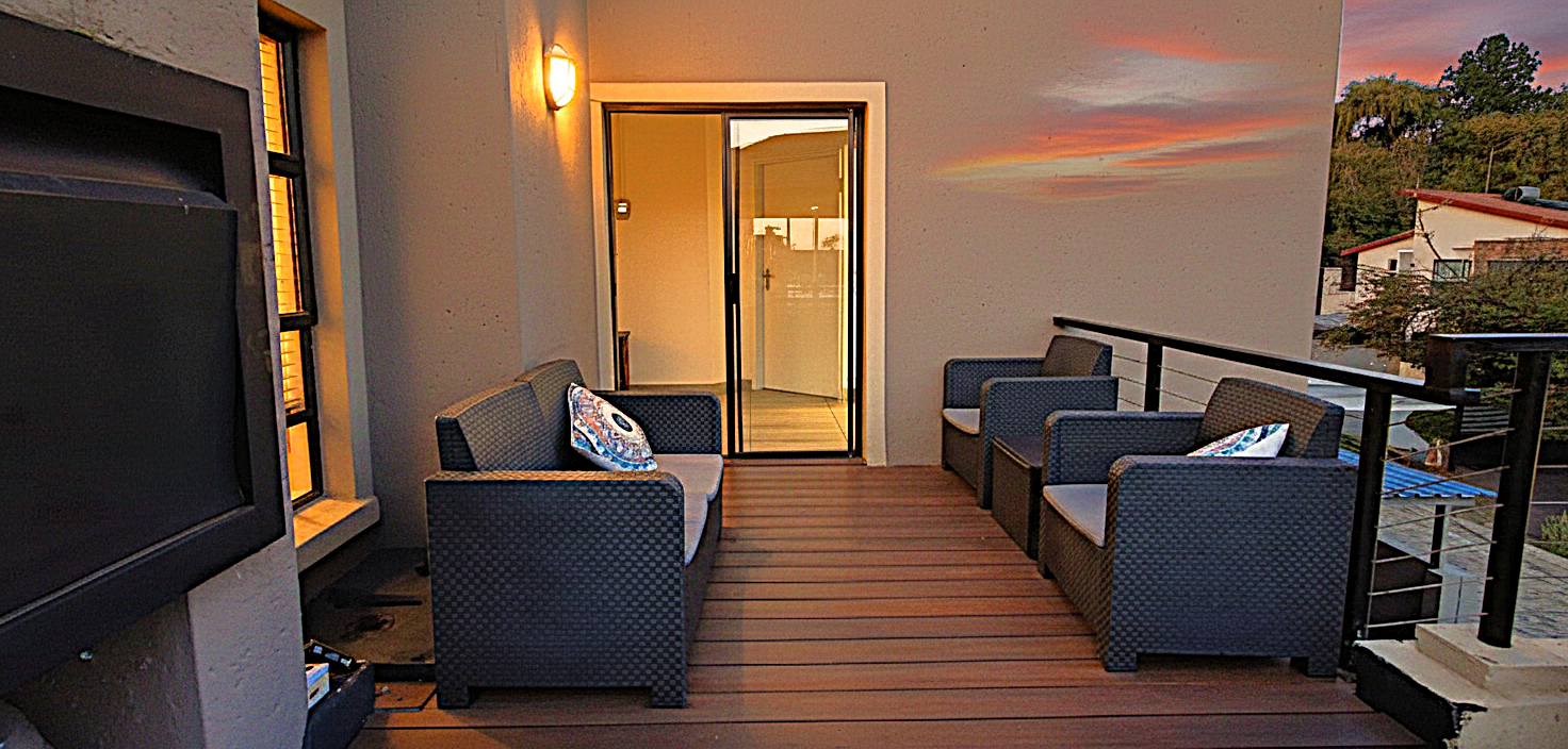 Private Upstairs Entertainment Deck with a Built-in Braai and lovely views for sunset relaxation.