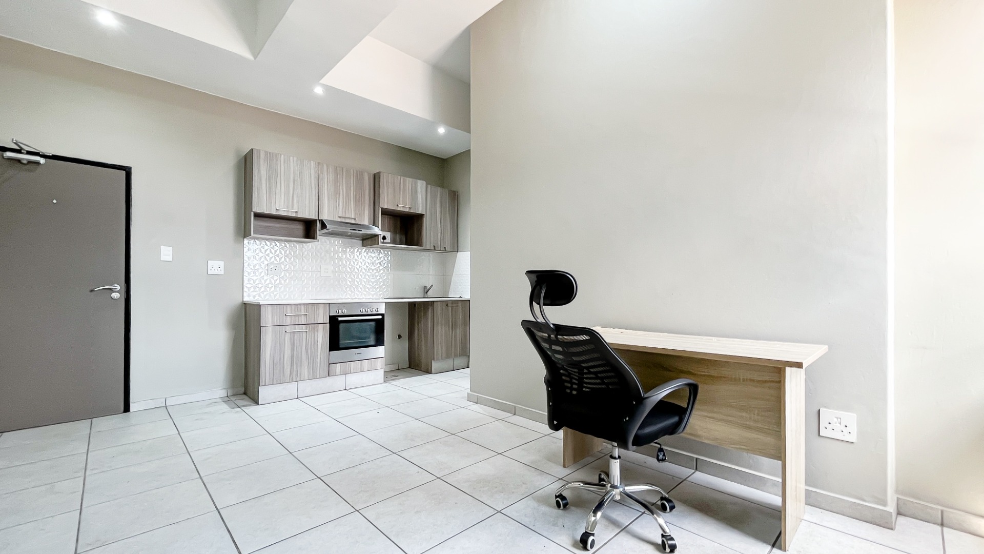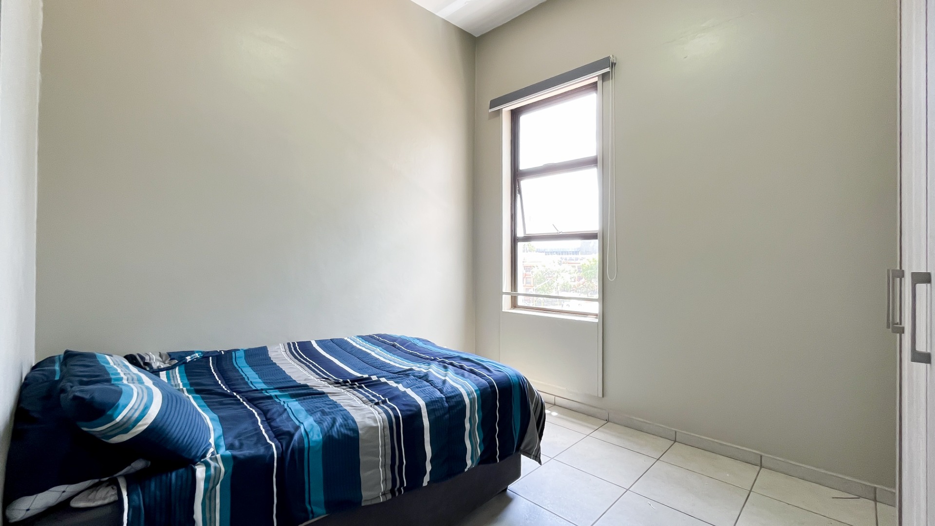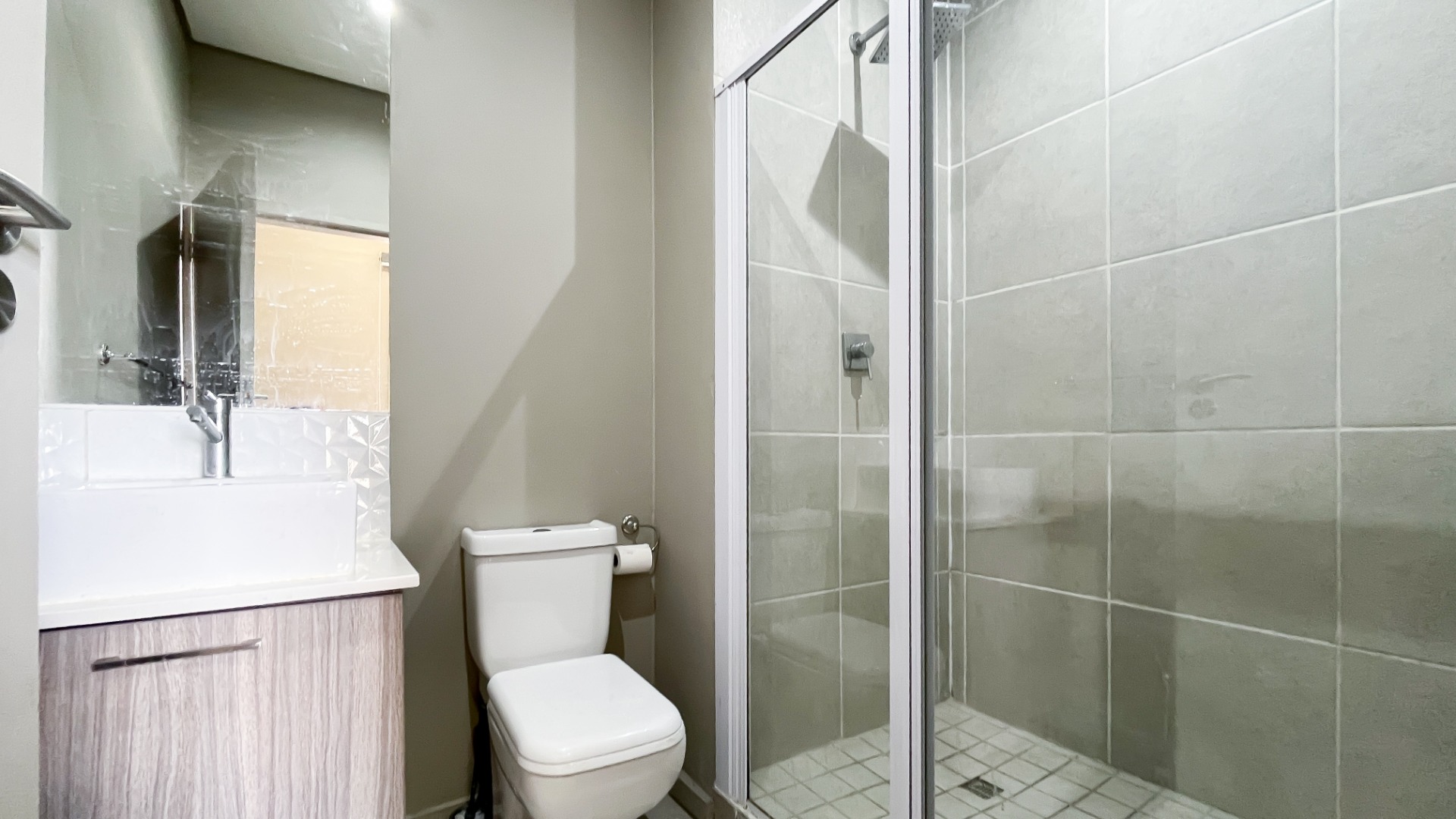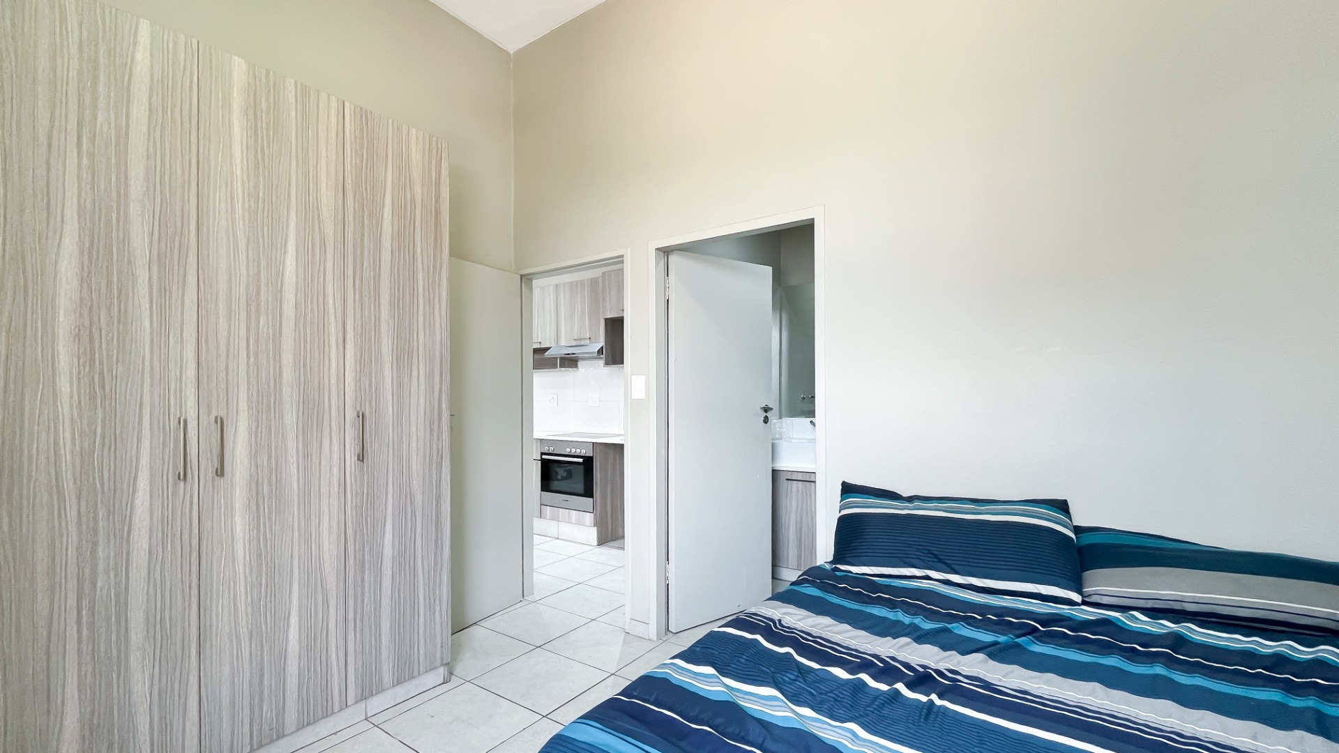 The generously sized bedroom comfortably accommodates a king-size bed with additional room for your lifestyle needs. Wall-to-wall built-in cupboards offer ample packing space. The modern en-suite bathroom is fitted with a sleek shower cubicle, basin, and loo.