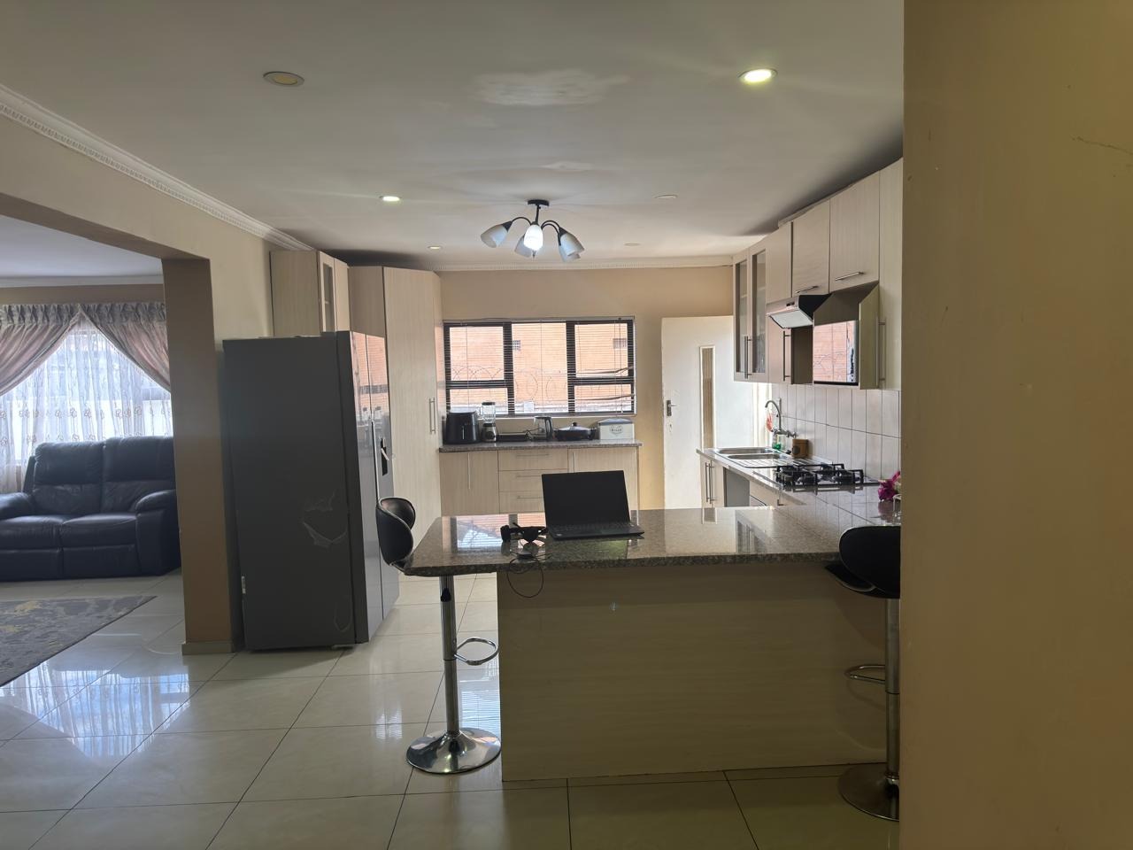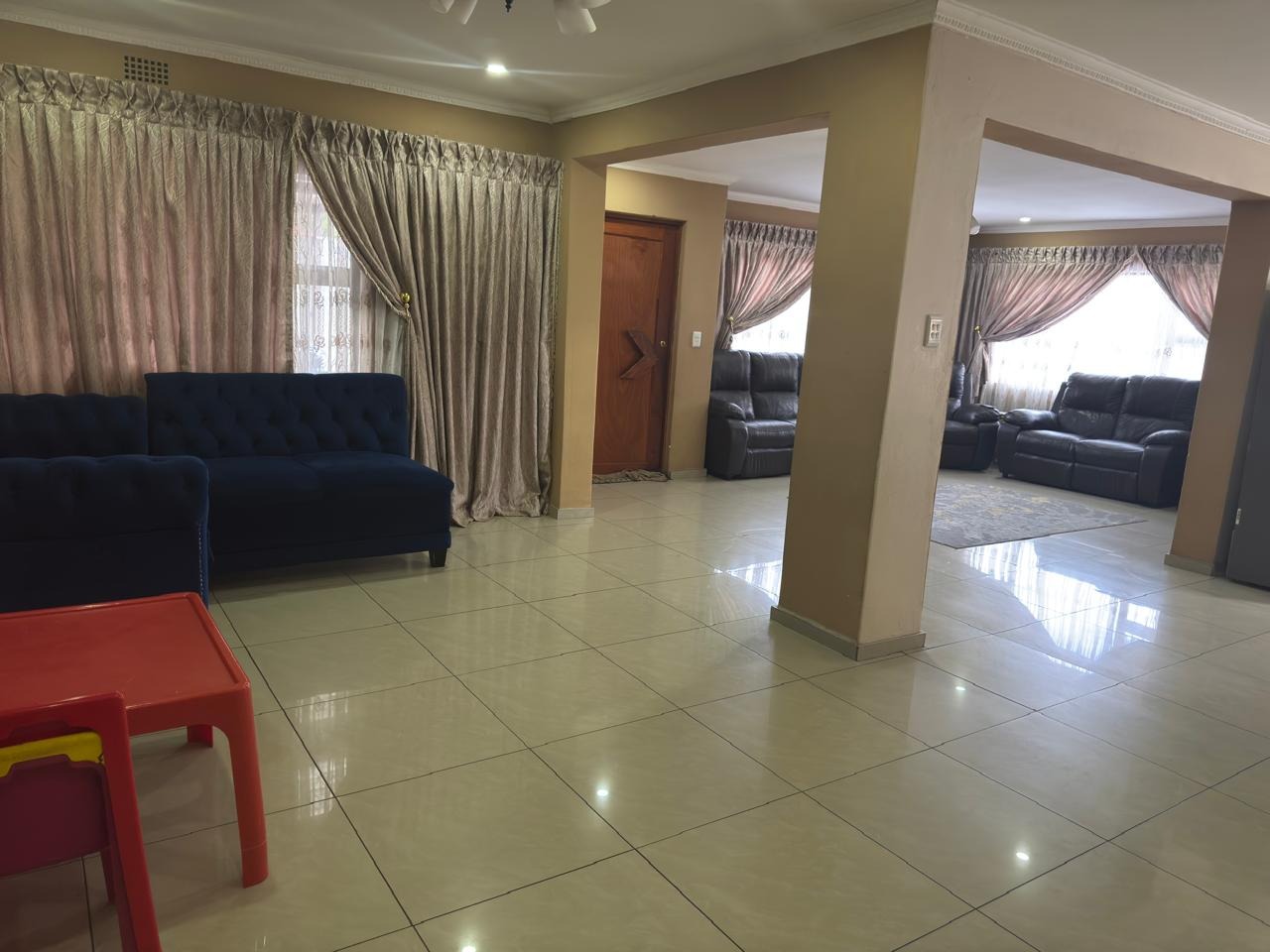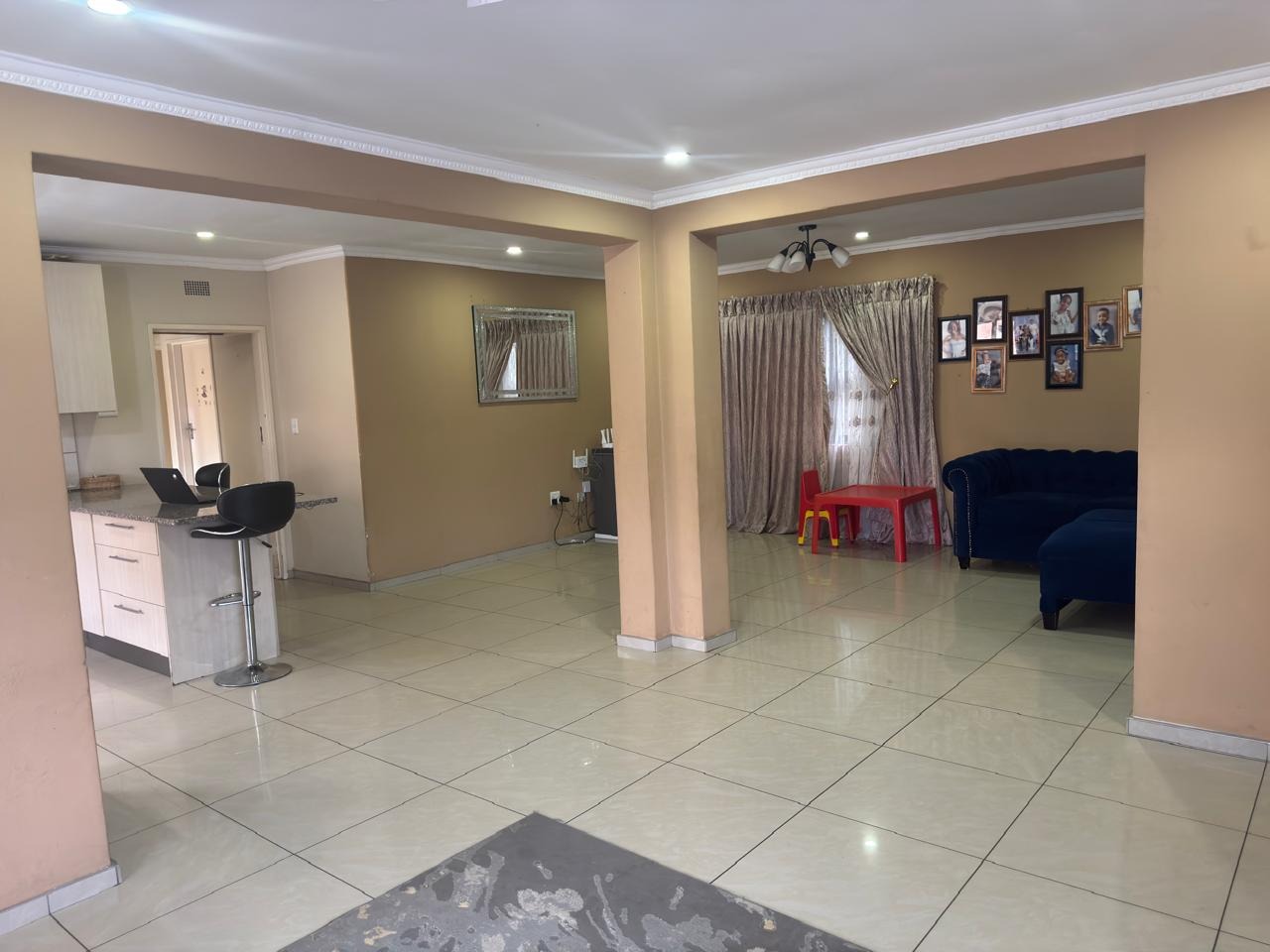 All bedrooms are fitted with built-in cupboards, providing ample storage. The home features a spacious open-plan layout that seamlessly integrates the living, dining, and kitchen areas, creating a welcoming and functional flow.