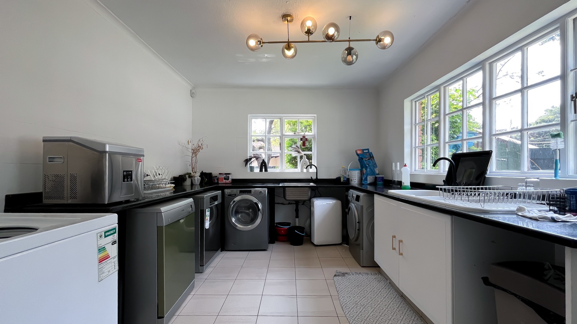 The kitchen is a standout feature, equipped with new SMEG and A?grade glass-top appliances, two standing ovens (one with a built?in air fryer), abundant cabinetry, a walk?in pantry, and a separate laundry and linen room for everyday practicality.