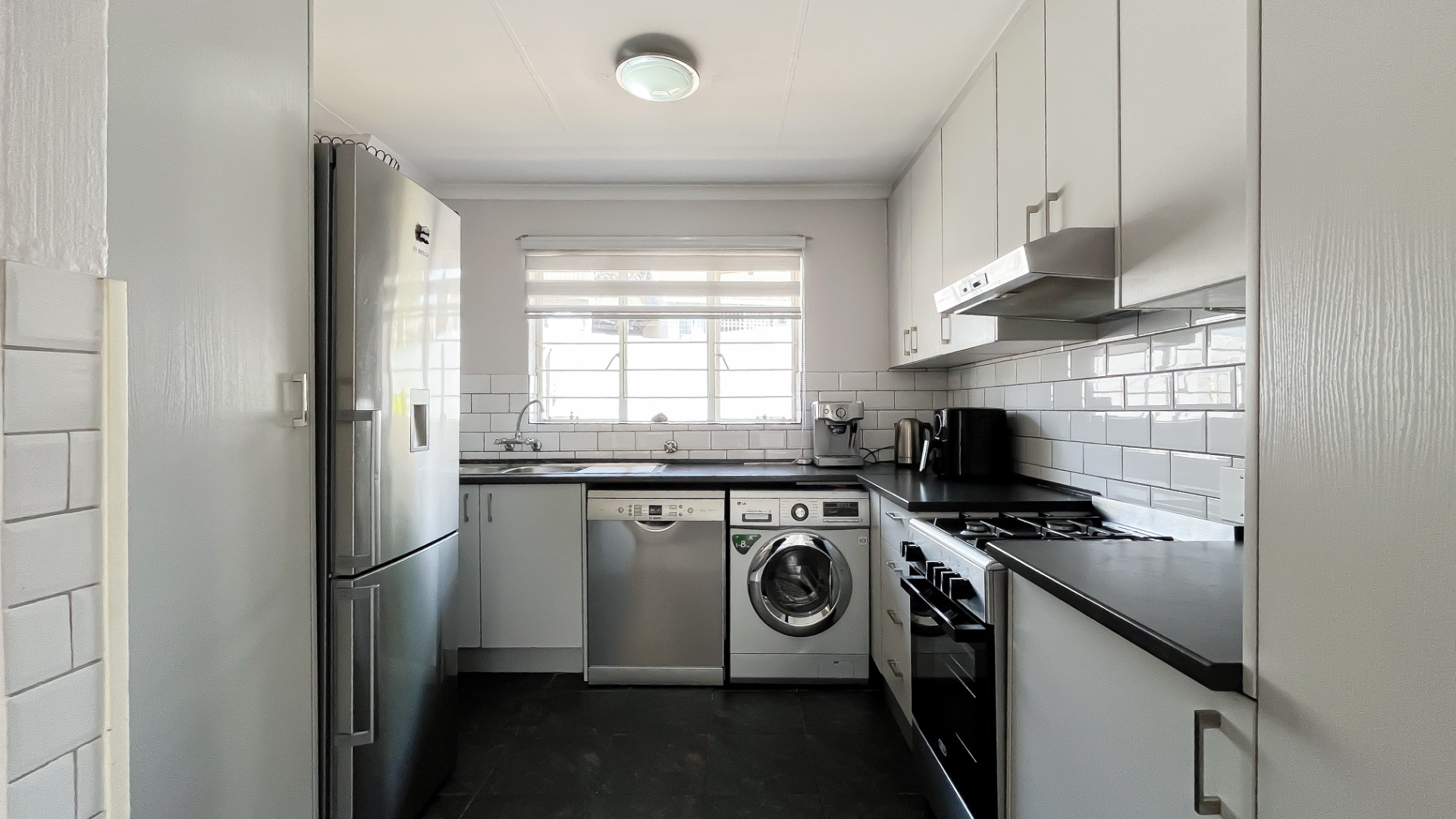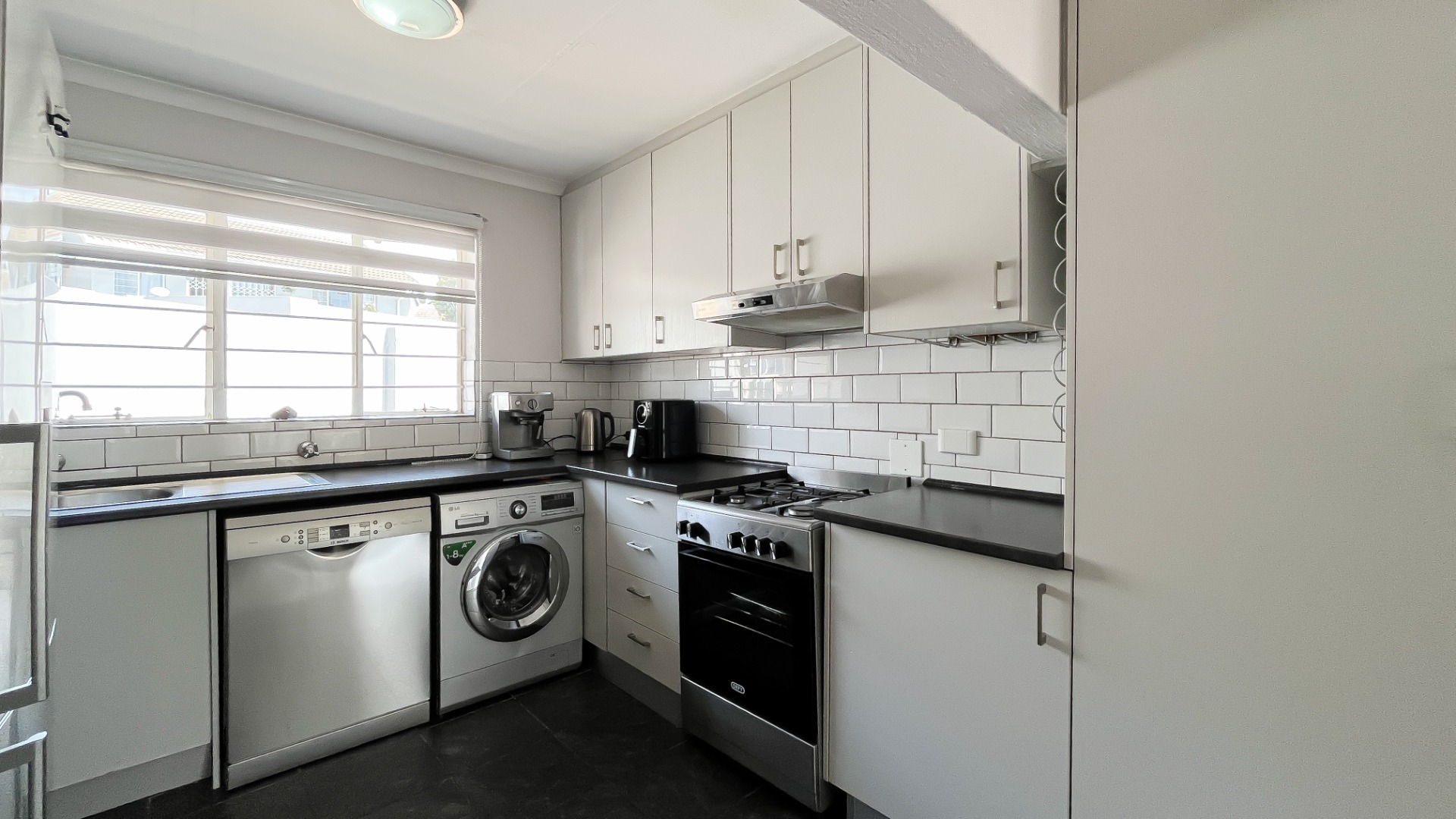 Step inside to an open-plan living and kitchen area, designed for seamless flow and modern comfort. The interior showcases a neutral colour palette and durable tiled flooring throughout, creating a bright and airy atmosphere. The lounge area is enhanced by a contemporary light fixture and offers access to an outdoor patio, perfect for relaxation. The compact yet highly functional kitchen is a highlight, equipped with sleek light grey cabinetry, dark countertops, a stylish white subway tile backsplash, and modern stainless steel appliances, including a gas hob, oven, dishwasher, and an integrated washing machine.