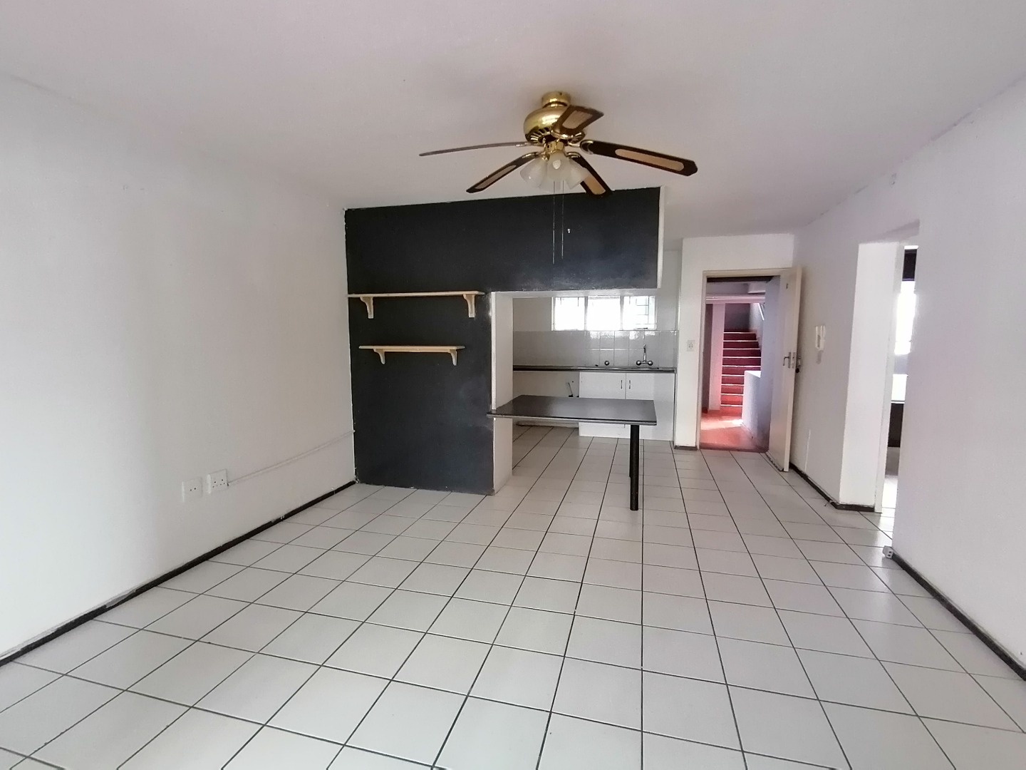 Open plan kitchen with space for appliances with open living room area.