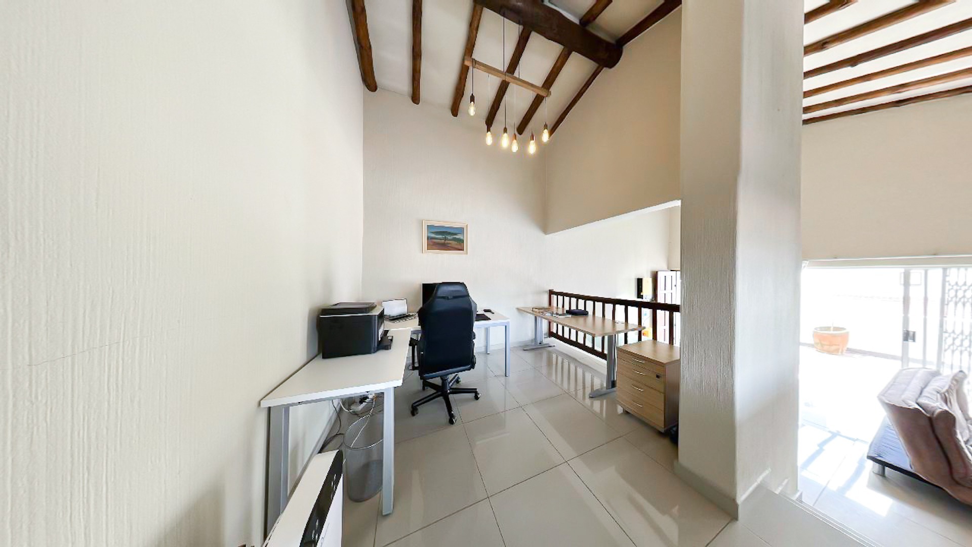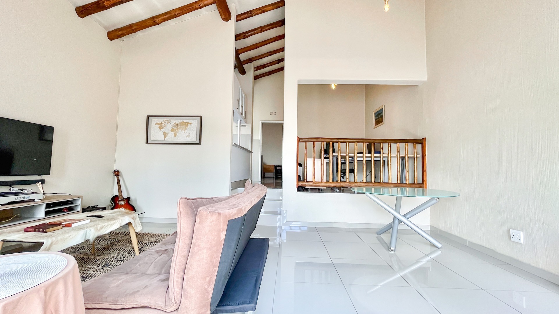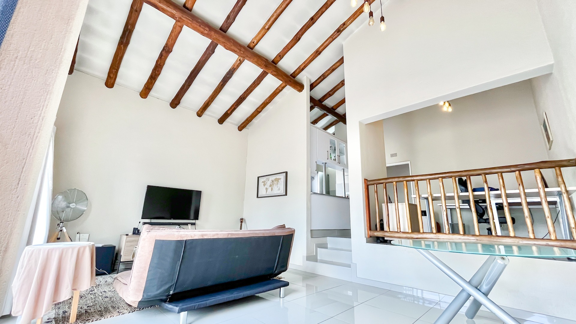 Discover modern living in this inviting 1-bedroom, 1-bathroom apartment located within a desirable complex in Bryanston, Sandton. This residence boasts striking high vaulted ceilings adorned with rustic exposed wooden beams, creating an immediate sense of spaciousness and character. The open-plan layout is complemented by contemporary tiled flooring throughout, ensuring a sleek and low-maintenance environment.