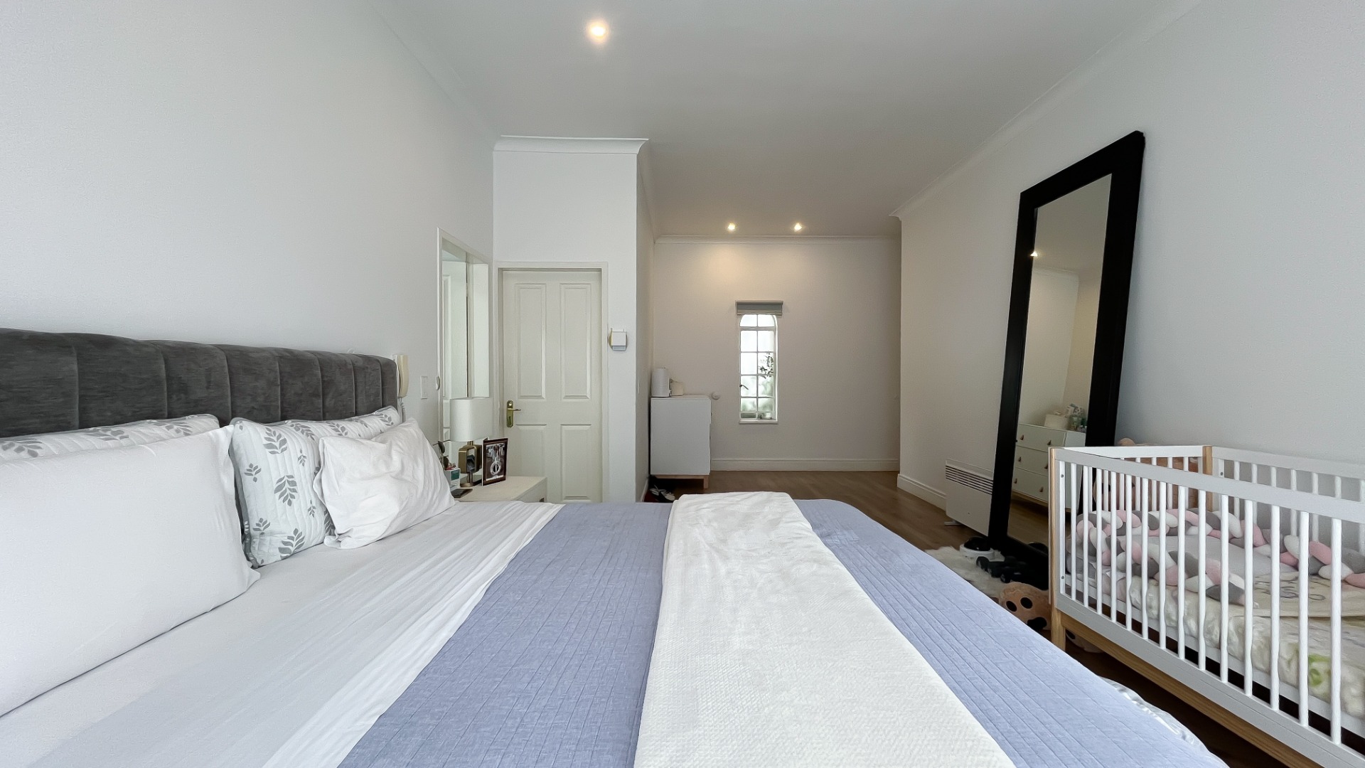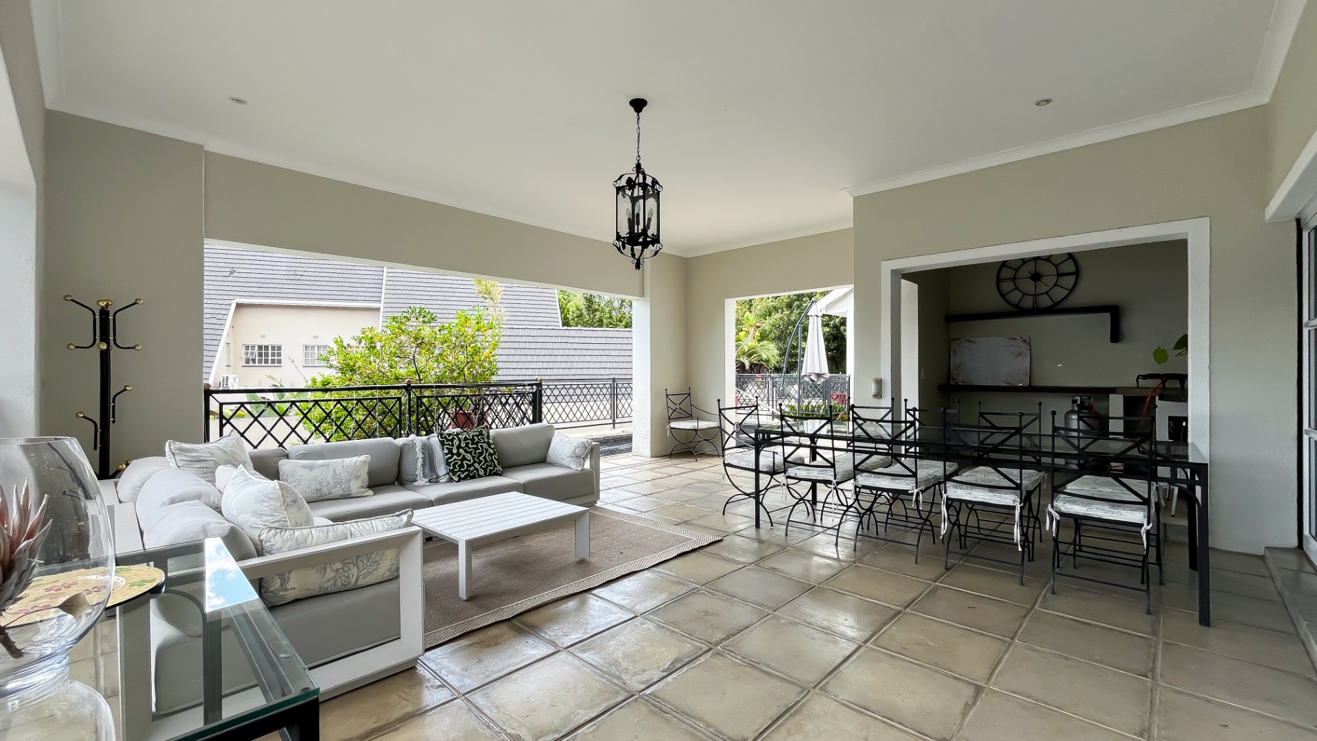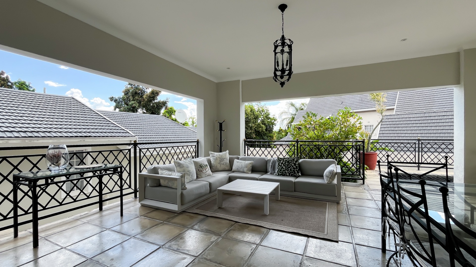 This Distinguished four-bedroom residence, nestled within a tranquil cul-de-sac in the esteemed Morningside suburb of Sandton, South Africa, offers an exceptional living experience. The property immediately impresses with its elegant provenance appeal, featuring a modern grey tiled roof, light-toned exterior walls, and an attractive arched entryway leading to a meticulously paved courtyard adorned with symmetrical potted plants and an ornate fountain.