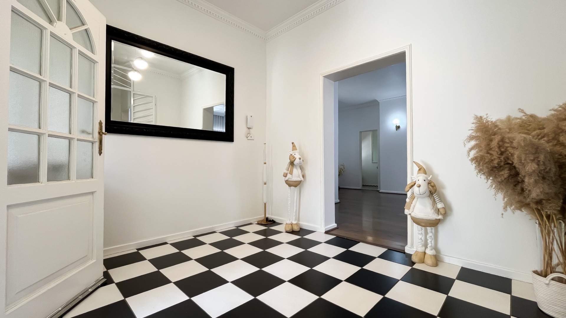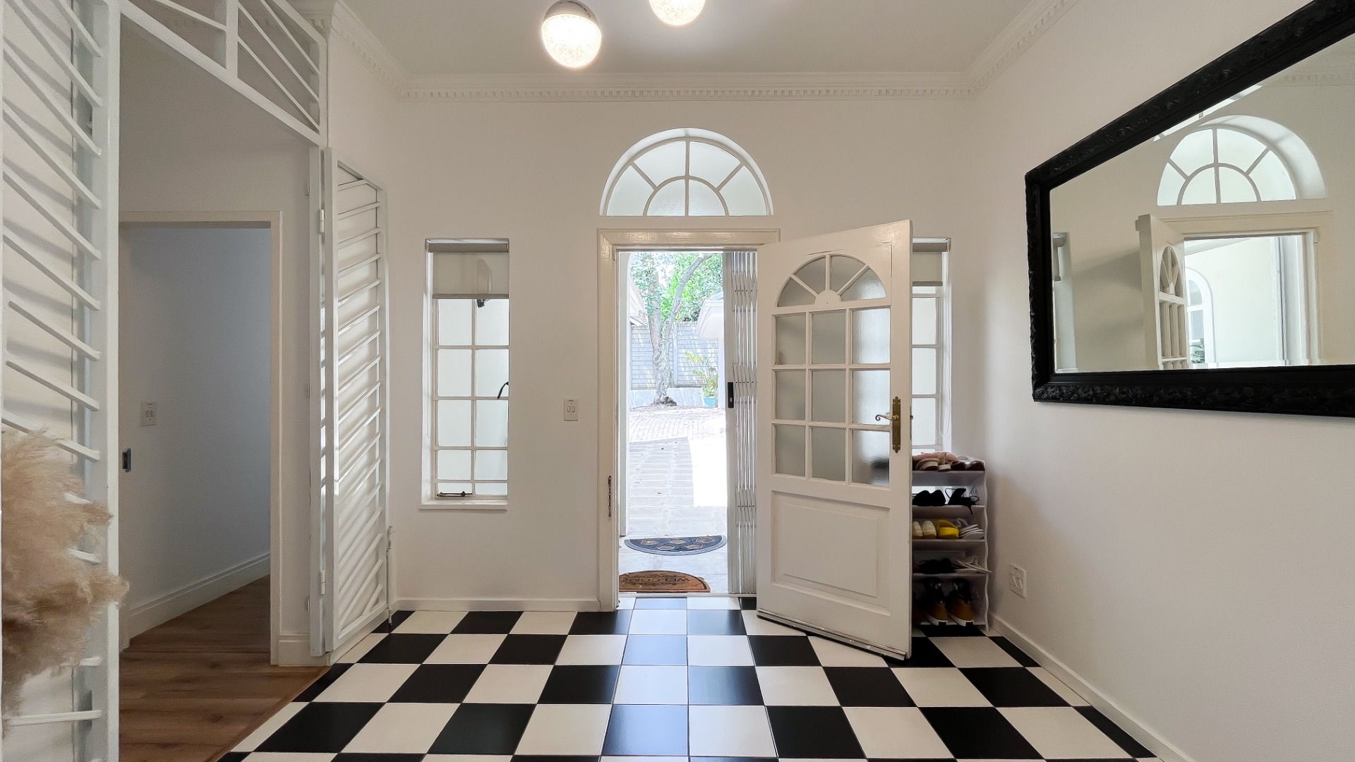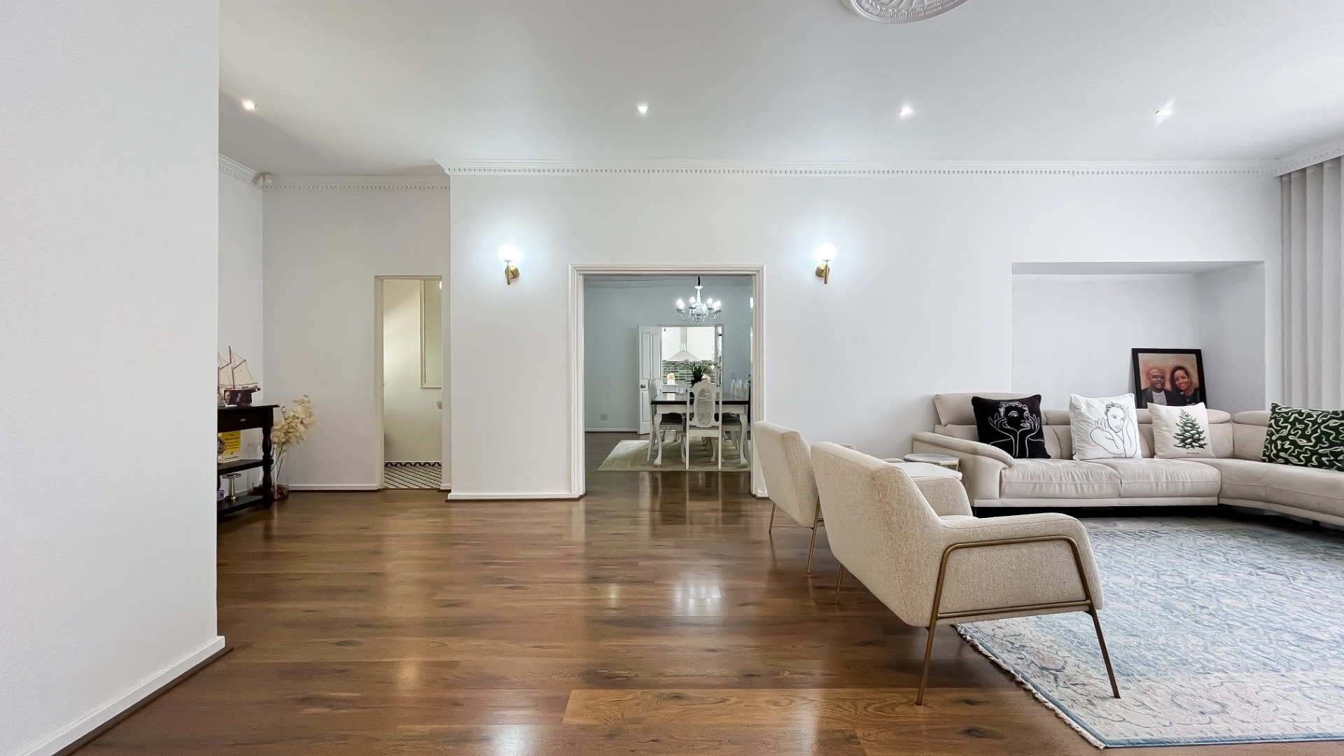 Upon entry, a bright and airy entrance hall welcomes with striking black and white checkered flooring, complemented by an arched transom and ornate ceiling molding. The expansive living areas are characterized by rich hardwood floors, elegant crown molding, and ceiling medallions, bathed in abundant natural light. A modern fireplace serves as a focal point, while the open-plan design seamlessly connects to a formal dining area, ideal for sophisticated entertaining. The residence is equipped with air conditioning for optimal comfort and features recessed lighting and wall sconces throughout.